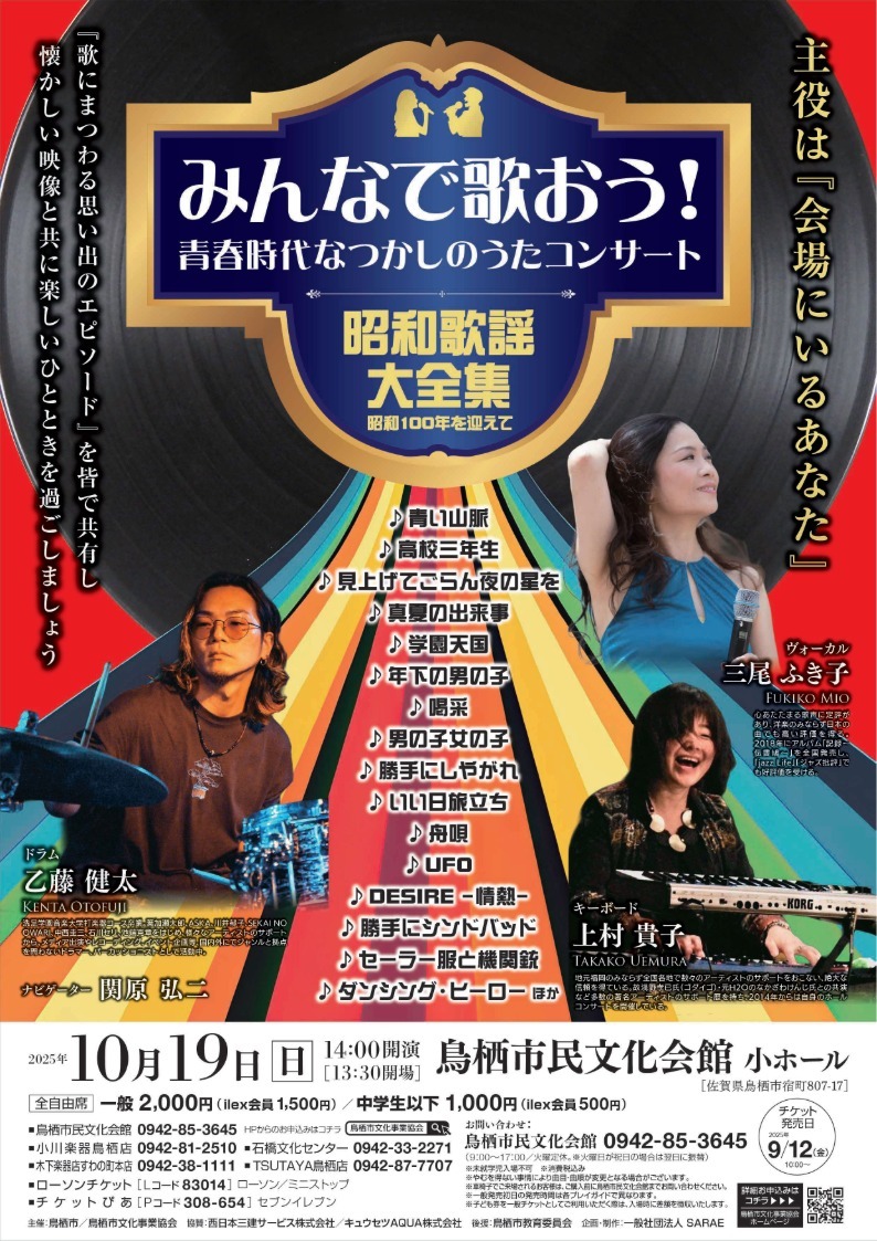 【当日券情報】 みんなで歌おう!青春時代なつかしのうたコンサート「昭和歌謡 大全集」昭和100年を迎えて 2025年10月19日(日)14時開演 #鳥栖市民文化会館小ホール 当日券販売13時30分~ 一般2000円、中学生以下1000円 懐かしい映像と共に楽しいひとときを過ごしましょう! tosu-bunka.jp/syowakayo