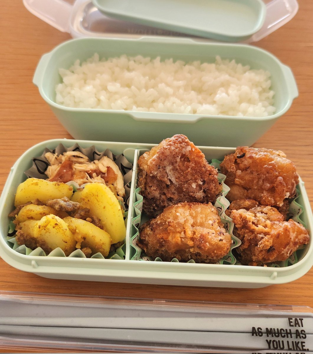 【お弁当3日目】お弁当最終日は娘の一番大好きな鶏のから揚げでした🥰 焼肉のたれや生姜などで下味をつけておいた鶏肉を朝から揚げました✨️ #お弁当 #中学生 #運動会 #鶏のから揚げ #じゃがいもと挽き肉のカレー粉炒め #鶏ささみの梅ぽん酢和え pic.x.com/ERfKYZrZ2T
