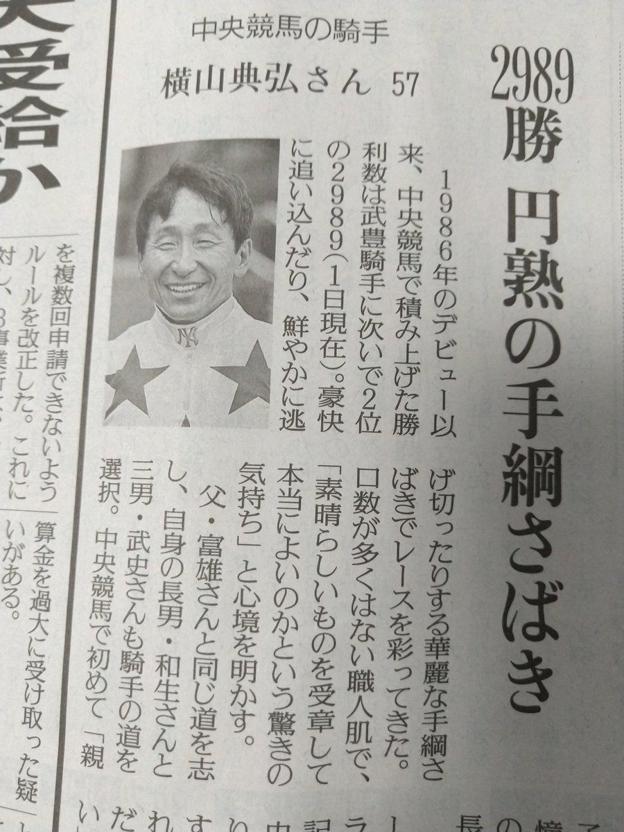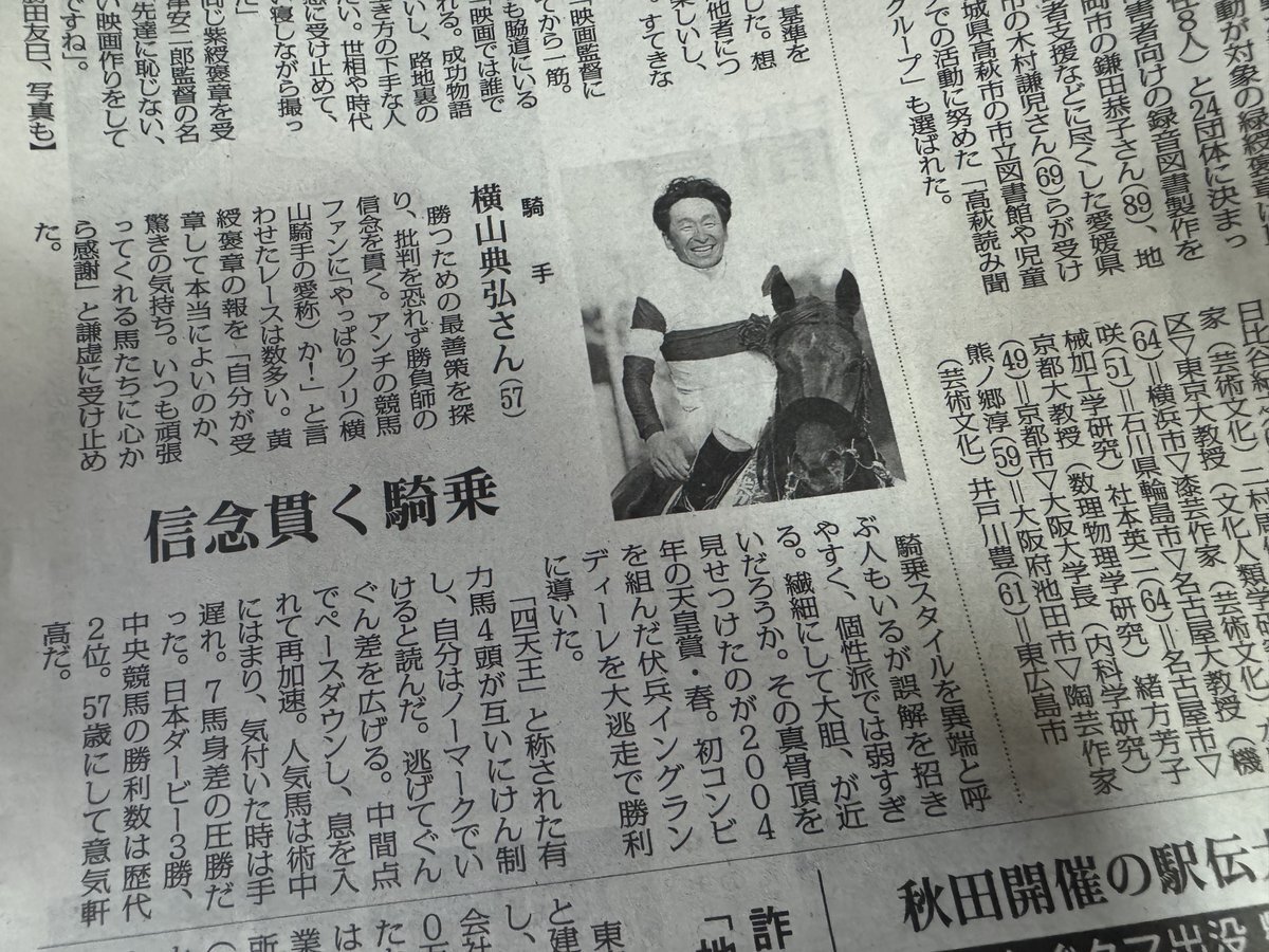 朝起きてネットでエバヤンの快挙を知り、読売新聞を開いたらノリさんの顔写真つき記事が載っていた😳 一日の始まりが情報多すぎる。 #競馬 #黄綬褒章 #横山典弘騎手 pic.x.com/oPatNKvDSu