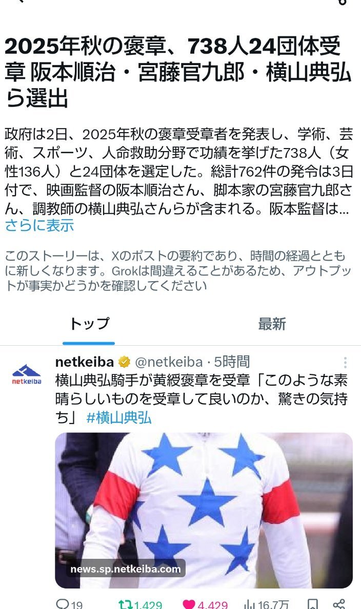 典さん おめでとうございます㊗️ #黄綬褒章 #横山典弘 x.com/livedoornews/s…