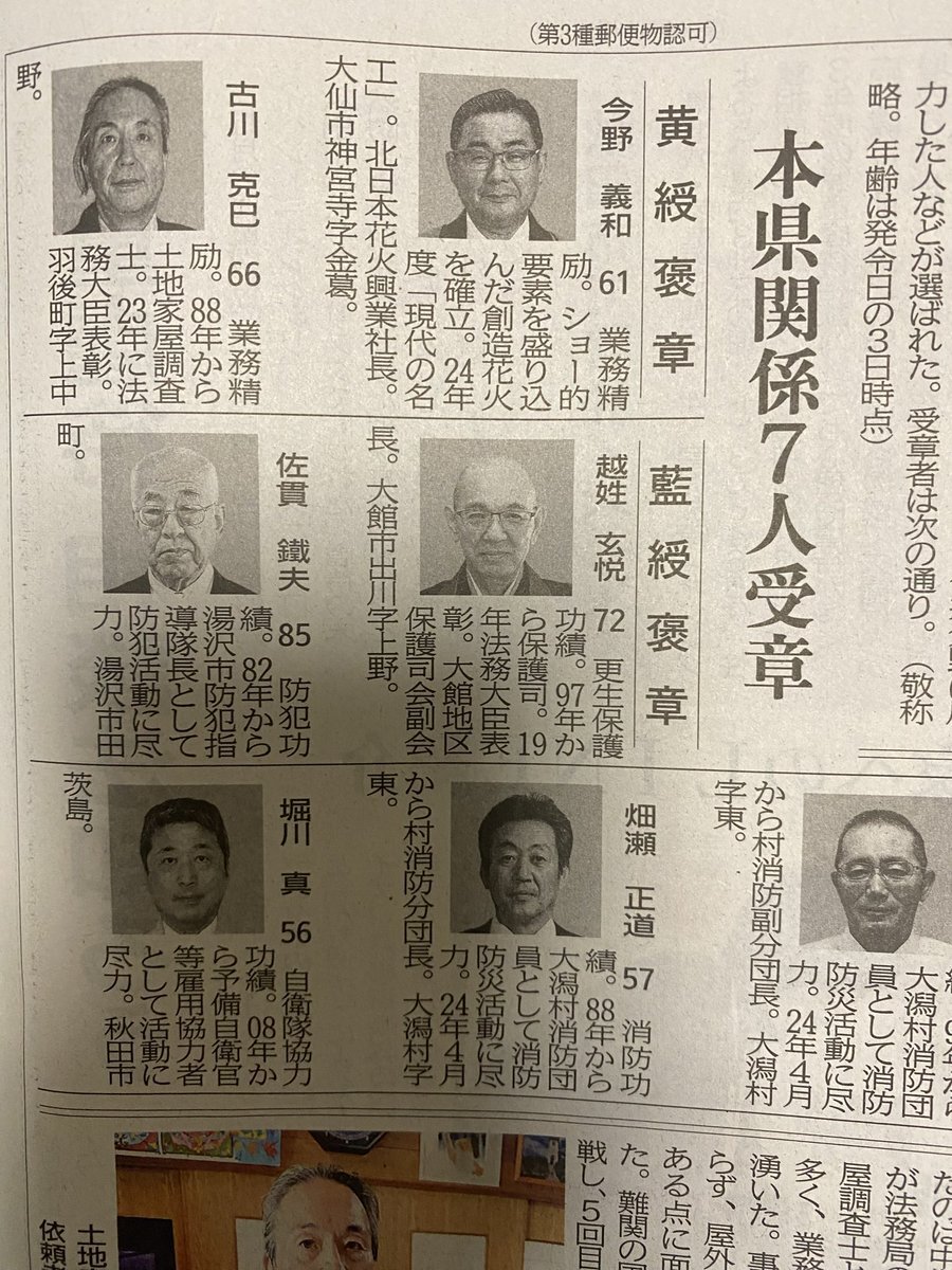 本日、秋の褒章受章者が発表になりました。 当社代表取締役 今野義和が黄綬褒章の栄誉に浴しました。謹んでご報告申し上げますとともに、感謝申し上げます。 #大曲の花火 #北日本花火興業 #黄綬褒章 pic.x.com/vuLFYWQG3a