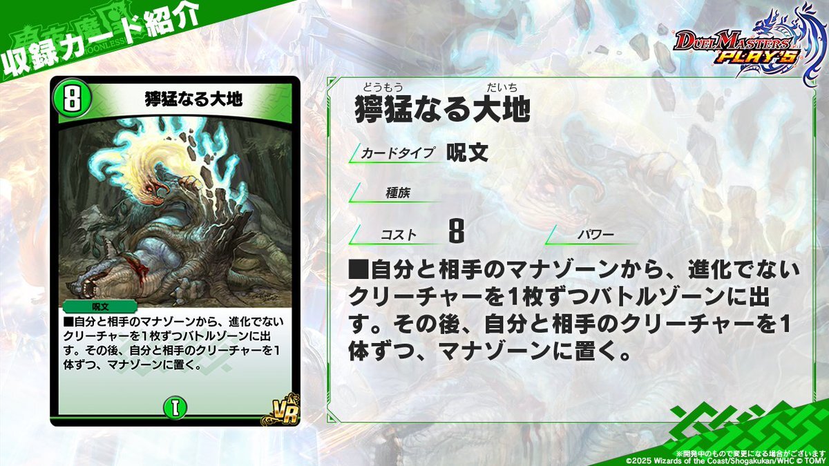 【第33弾カード情報】 《獰猛なる大地》 星に住む生命が成長するように、星自身もゆっくりとその姿を変えていく。 #デュエプレ #黒夜の魔凰 pic.x.com/LAjYHQqFog