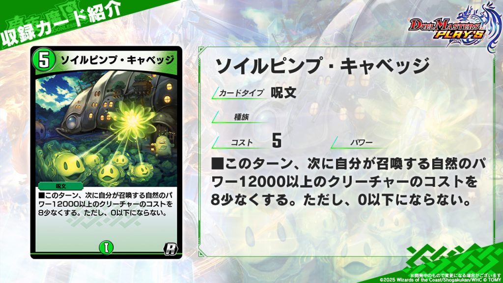 コロコロオンライン独占デュエプレ最新弾情報! 高コストの自然文明クリーチャー召喚を強力にサポートできる《ソイルピンプ・キャベッジ》!! #デュエプレ #黒夜の魔凰 corocoro-news.jp/news/398775/