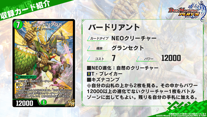 【第33弾新カード独占公開】 本日は《バードリアント》\( 'ω')/ キズナ能力でパワー12000以上のクリーチャーを踏み倒す効果を持ったグランセクト! #デュエプレ #黒夜の魔凰 ▼新カード事前評価募集中! kamigame.jp/%E3%83%87%E3%8…
