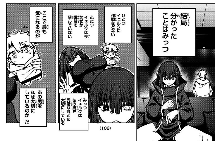 命懸けの戦いと下ネタが絡み増えていくしのぎのしもべたち。 しのぎが強くなるため迦楼羅組へ突撃した辺りからしのぎの異質さが徐々に実感することができ、面白かった。 しもべが増えていく中でイェルクが嫉妬したり等、喜怒哀楽がよりわかりやすくなり迫られ日和るのも可愛い。 #黒月のイェルクナハト pic.x.com/BpSqb7U41f x.com/kousuzumoto110…