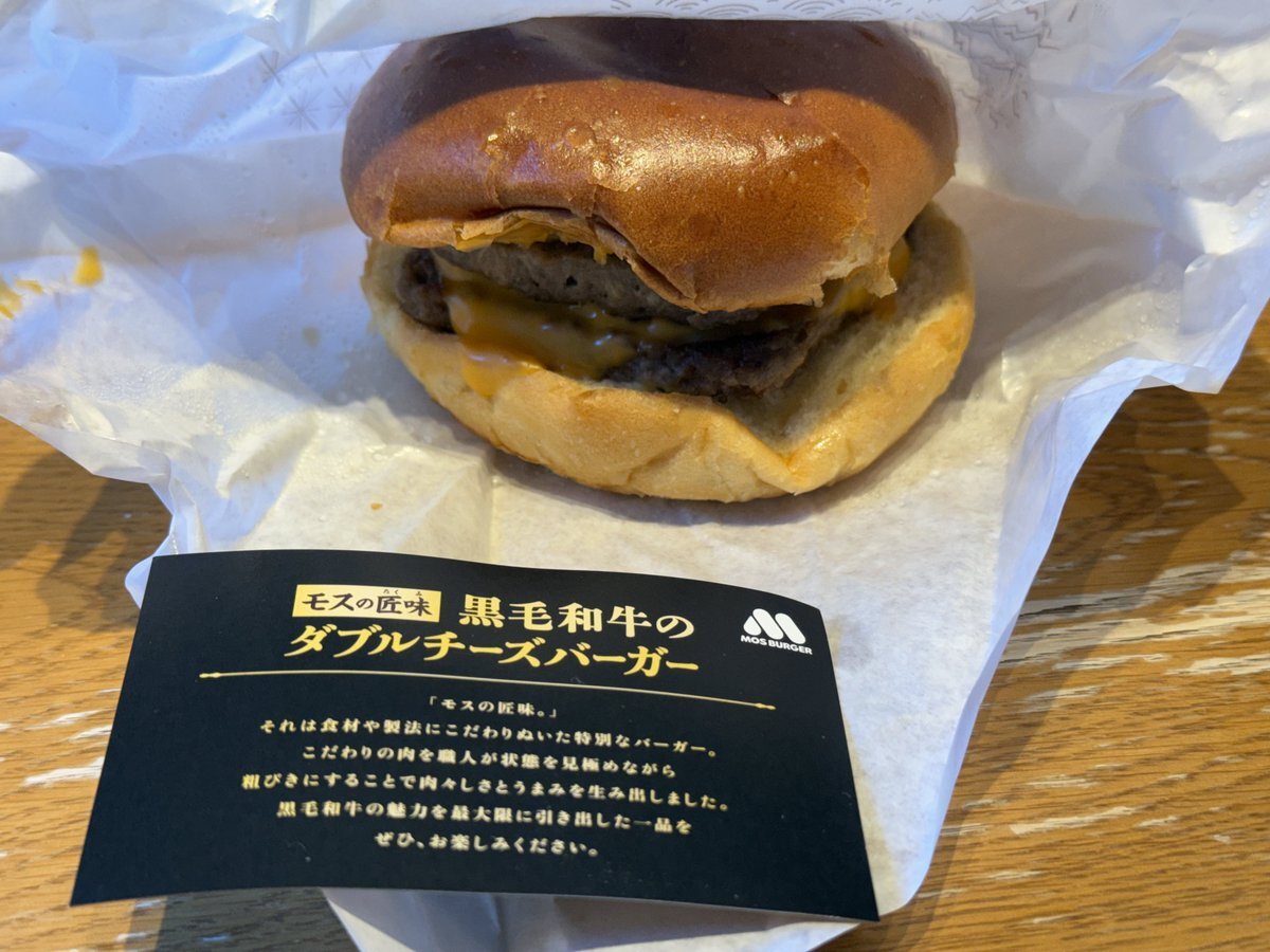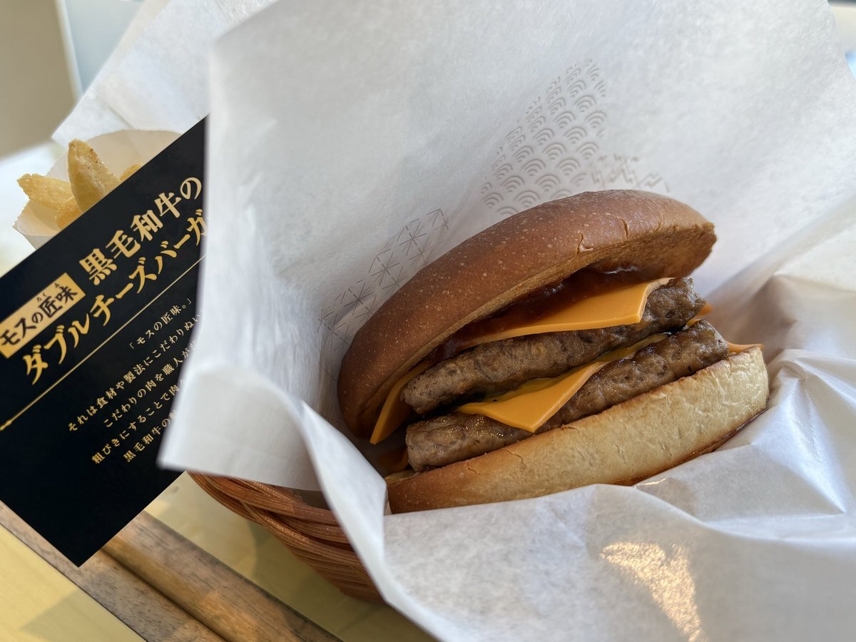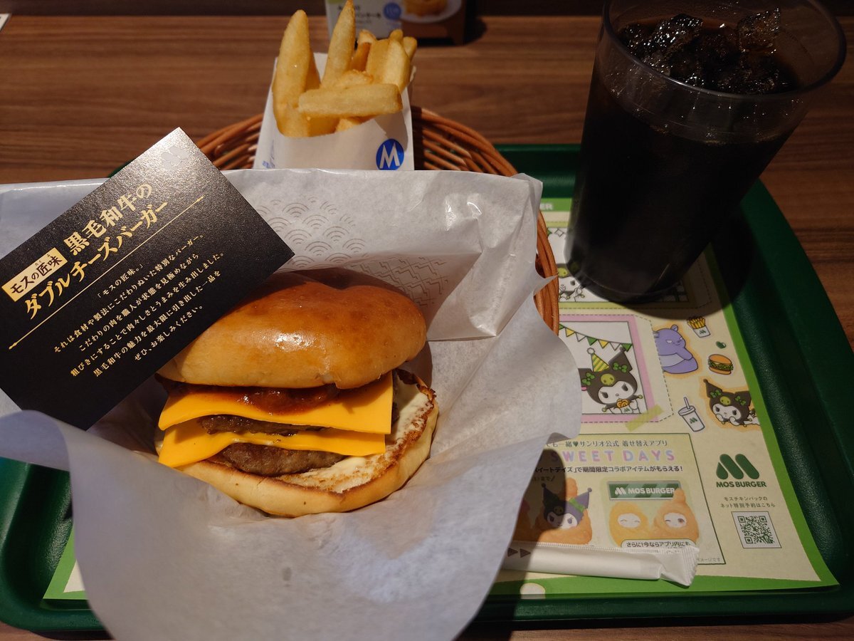 久々にモス 黒毛和牛のダブルチーズバーガー マイメロとのコラボが始まったせいかメチャ混みでテイクアウトに時間かかった~。。。 #お昼ごはん #モスバーガー #黒毛和牛のダブルチーズバーガー pic.x.com/ddHSUnmiAT