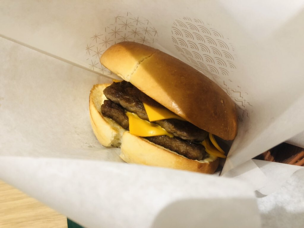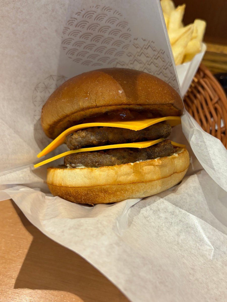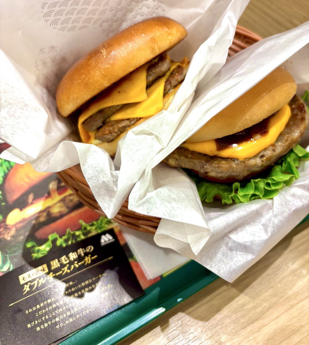久々にモス 黒毛和牛のダブルチーズバーガー マイメロとのコラボが始まったせいかメチャ混みでテイクアウトに時間かかった~。。。 #お昼ごはん #モスバーガー #黒毛和牛のダブルチーズバーガー pic.x.com/ddHSUnmiAT