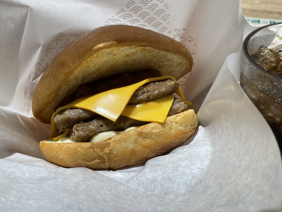 和牛はハンバーガーには 向かない論者だったのだが 脂身の少ない部位を 使っているのか 純粋に肉の旨味を楽しめる。 ソースも物によっては強すぎて 素材の味に勝ってしまうことがあるが これは主張し過ぎずに美味しい。 野菜がないのは彩り的には寂しいが これも正解 #黒毛和牛のダブルチーズバーガー