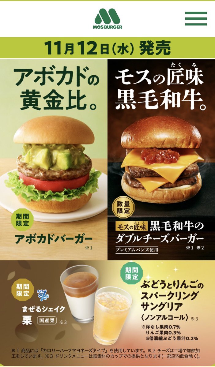 / 📢予告:11月12日(水)~ ご褒美にぴったりなバーガーが登場! \ 🥑アボカドバーガー レタス、トマト、パティ、ごろっとアボカドにオリジナルマヨソースをかけて濃厚な口溶け🤤食べ応えも抜群です💛 🤎モスの匠味 黒毛和牛のダブルチーズバーガー