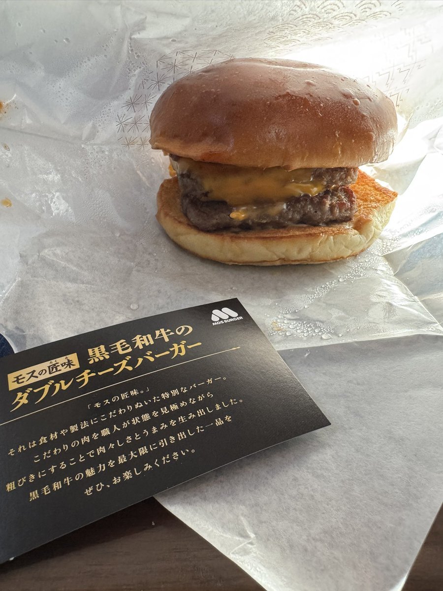 モスで黒毛和牛のダブルチーズバーガーを 食べたんだけど、パティは最初から冷めてるし、肉パサパサだし… なんかモスバーガーってもっと美味しかったのにって悲しくなった(›´-`‹ ) #モスバーガー #黒毛和牛のダブルチーズバーガー pic.x.com/MEoWmljv1R