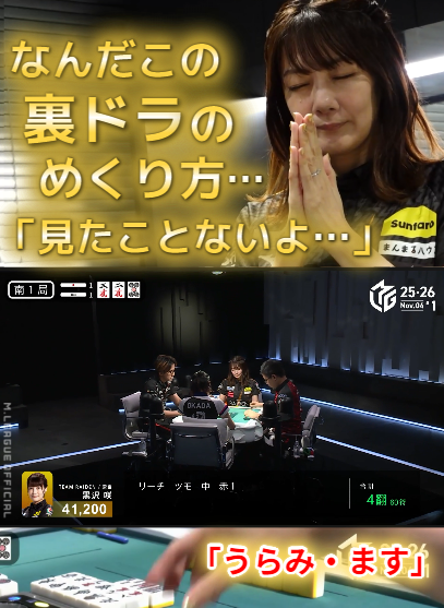 【うらみ・ます】#黒沢咲 こんなに裏ドラめくれるのに1枚ものらないなんて… そんなことより黒沢咲の裏ドラのめくり方が個性的過ぎる… #Mリーグ #abema #黒沢咲 #team雷電 #松島桃 #多井隆晴 youtube.com/shorts/JvS0m8z… pic.x.com/C4nli46Iid