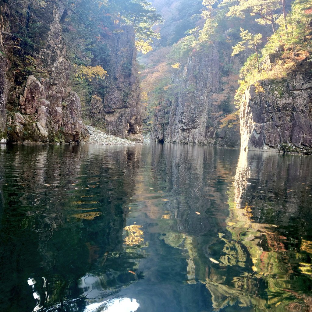 三段峡入り口から、#黒淵 は、結構坂が大変でした。極めつけは、私の苦手な吊り橋。黒淵の渡しが、往復運行しているなら、吊り橋を渡らず、一番の坂を通らず楽できます。昨日は、渡しは下り方向だけでした。写真は、黒淵と、渓谷沿いの道。一年ぶりの登山靴を干してます。 pic.x.com/B9AVehrIai