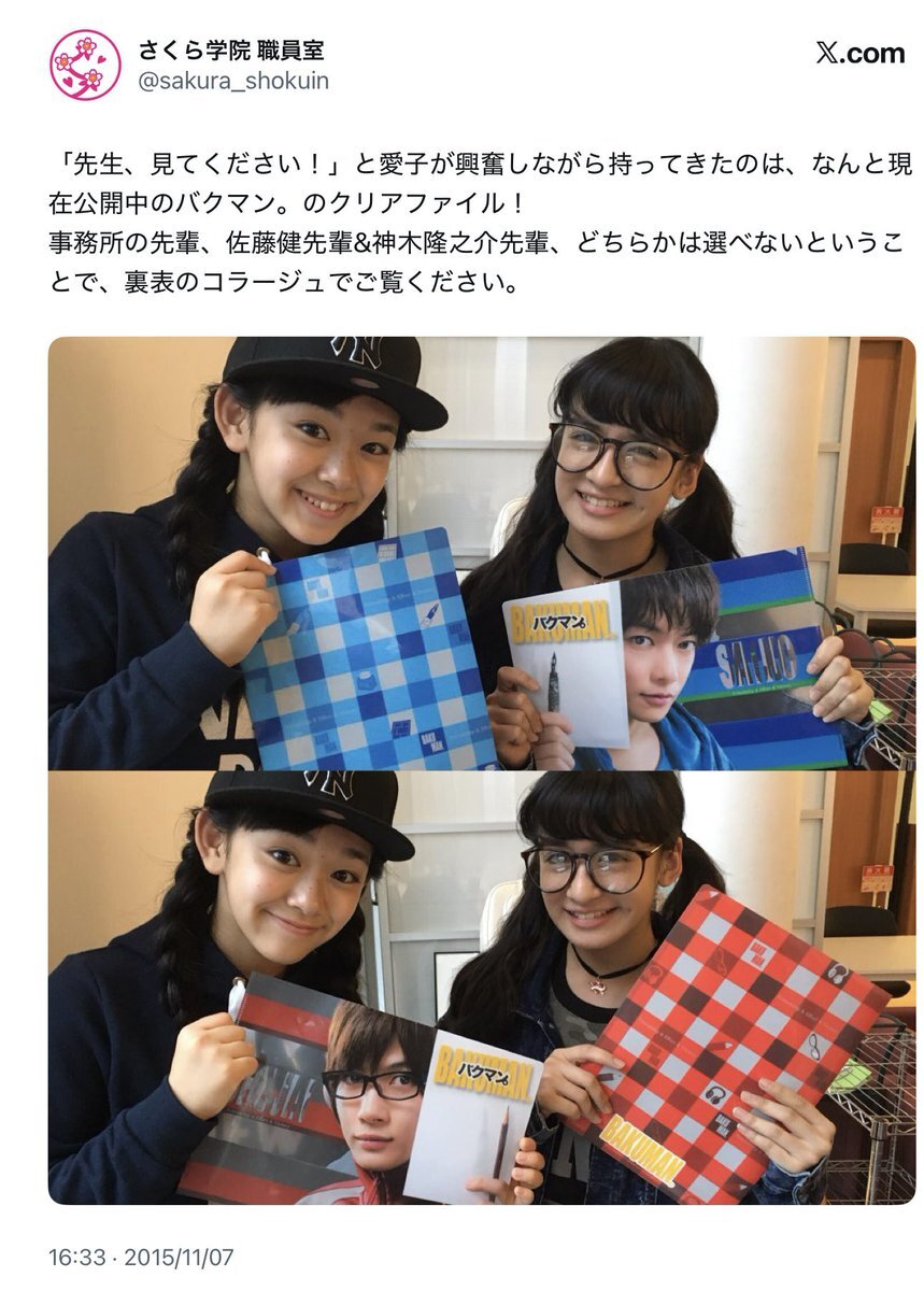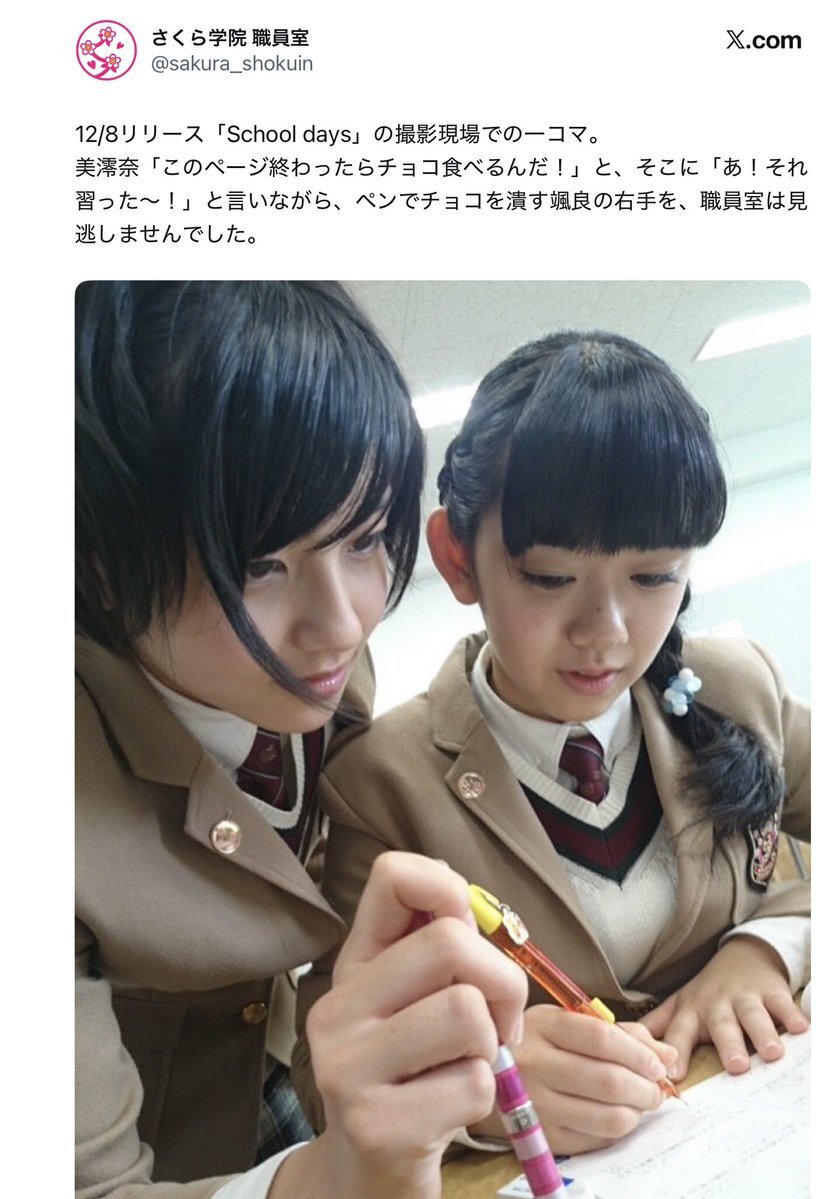 7年前の今日の職員室ツイート振り返り。この次の瞬間を捉えたショット添えて。この2人、まさに陰と陽っていう感じで素敵なコンビだったなぁ。またどこかで2人が並んでる姿を見たいなぁ。 #さくら学院 #倉島颯良 #黒澤美澪奈 x.com/sakura_shokuin…