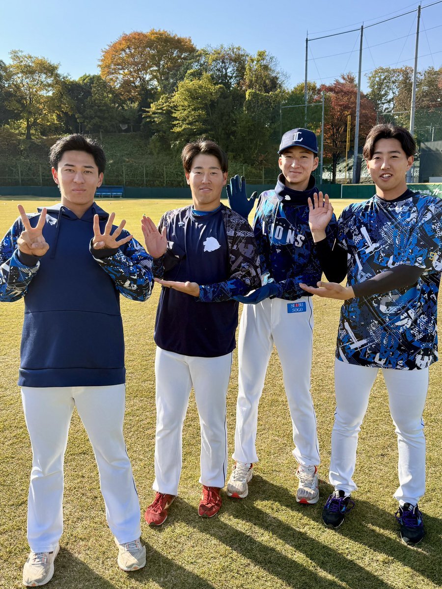 今日誕生日の #上田大河 投手をお祝いする投手陣! …のはずが、「24」ポーズをしているのはなぜか #杉山遙希 投手🤣   #川下将勲 投手、#黒田将矢 投手も一緒に、にぎやかな1枚をお届けします!   #埼玉西武ライオンズ #seibulions #所沢秋季キャンプ pic.x.com/j3lZk8IPGk
