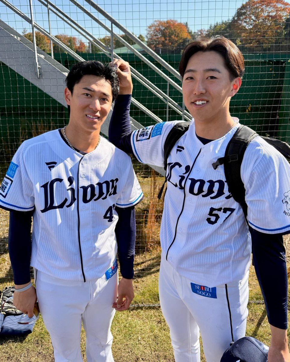 午前練習を終えた #杉山遙希 投手と #黒田将矢 投手! オフに髪色を変えた杉山投手、黒髪も似合ってますよね? #埼玉西武ライオンズ #seibulions #所沢秋季キャンプ pic.x.com/9AJkPjGLcp