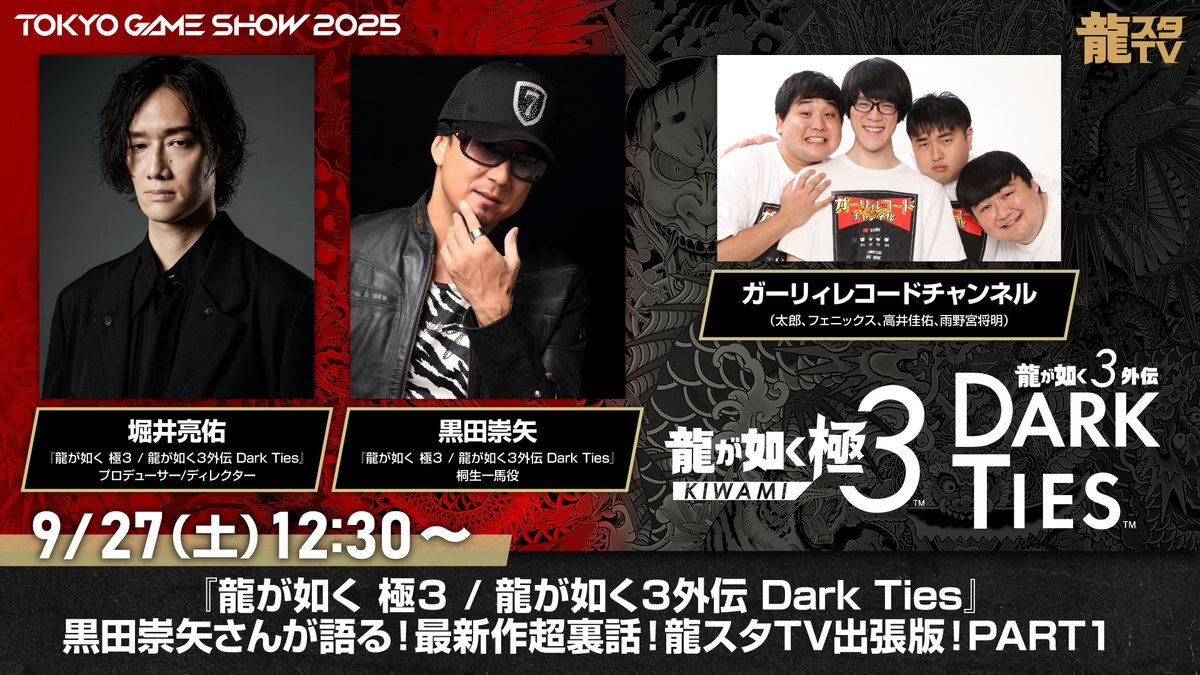 【#TGS2025 Day3】 ただいまセガブースにて、「『龍が如く 極3 / 龍が如く3外伝 Dark Ties』黒田崇矢さんが語る!最新作超裏話! 龍スタTV出張版!PART1」を実施中! ⇒youtube.com/live/6P__NQyTx… 一足先に、「『龍が如く 極3 / 龍が如く3外伝 Dark Ties』をプレイします!!✨ #龍が如く極3