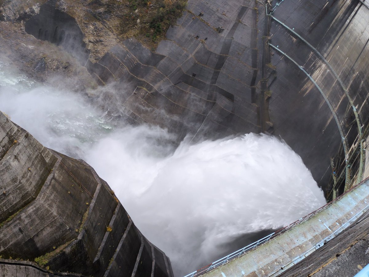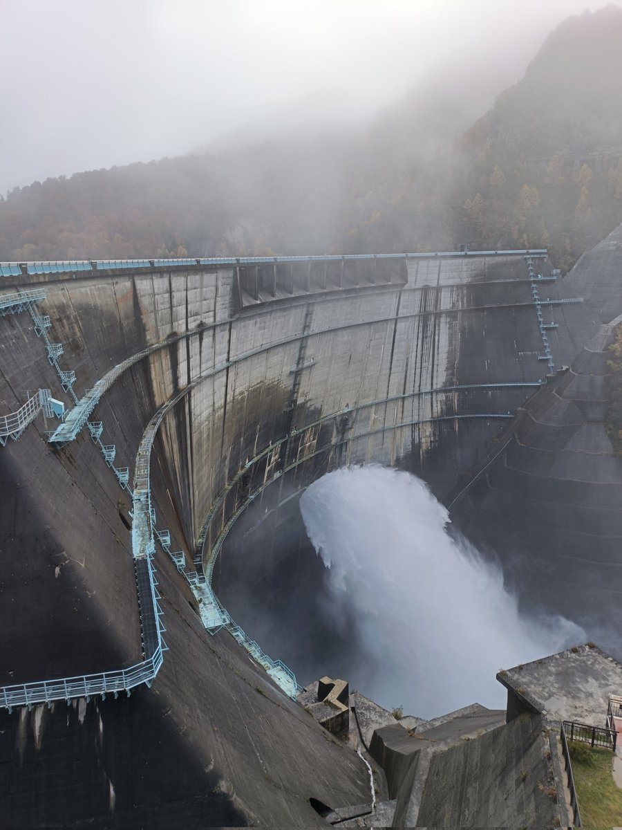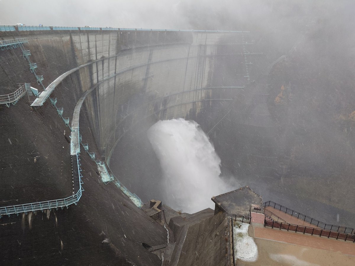 黒部立山アルペンルート 大雪…猛吹雪の中、黒部ダムにやって来た💦 観光用放水は10月中旬で終わってしまったという話を聞いていたけど、ガチの放水をしていたので良いモノが見られた!凄い迫力だった! #黒部立山アルペンルート #黒部ダム #黒部ダム放水 #室堂 #立山そば #立山そば室堂ターミナル店 pic.x.com/wzv1I72EjF