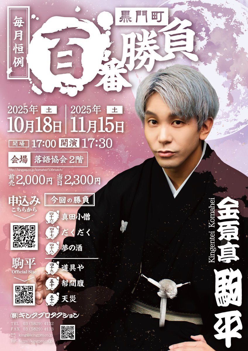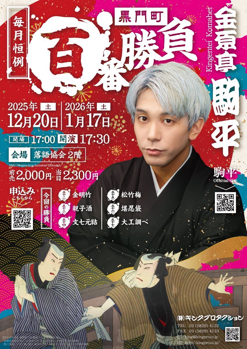 来月の #黒門町百番勝負 のお知らせ‼︎ 毎月恒例 #金原亭駒平 第17回 『黒門町百番勝負』 11月15日(土)17:30開演 会場 落語協会2階 前売 ¥2000 演目 「道具や」「幇間腹」「天災」 次回も二席根多おろし、何卒よろしくお願い申し上げます🙇 ▽ご予約・詳細はこちら▽ kingpro.co.jp/komahei/news/a…