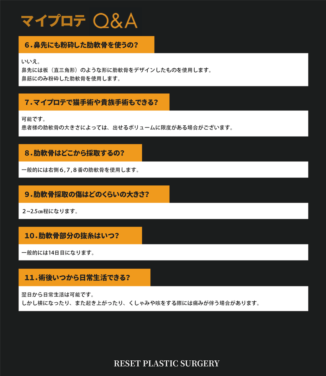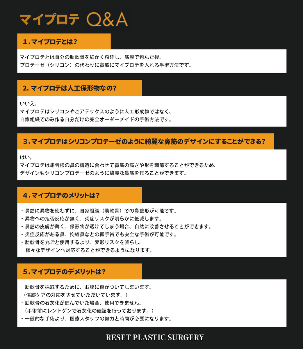 自家組織鼻整形✨ 🍀マイプロテ🍀 Q&A 🤲マイプロテに関する質問と回答をまとめました。 鼻の手術専門💫 予約 & 相談 ▶️ lin.ee/HkpG433 #鼻の整形 #リセット整形外科 #鼻の再手術 #鼻の手術 #マイプロテ pic.x.com/GIwmnQiXrI