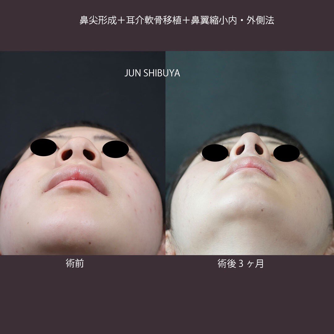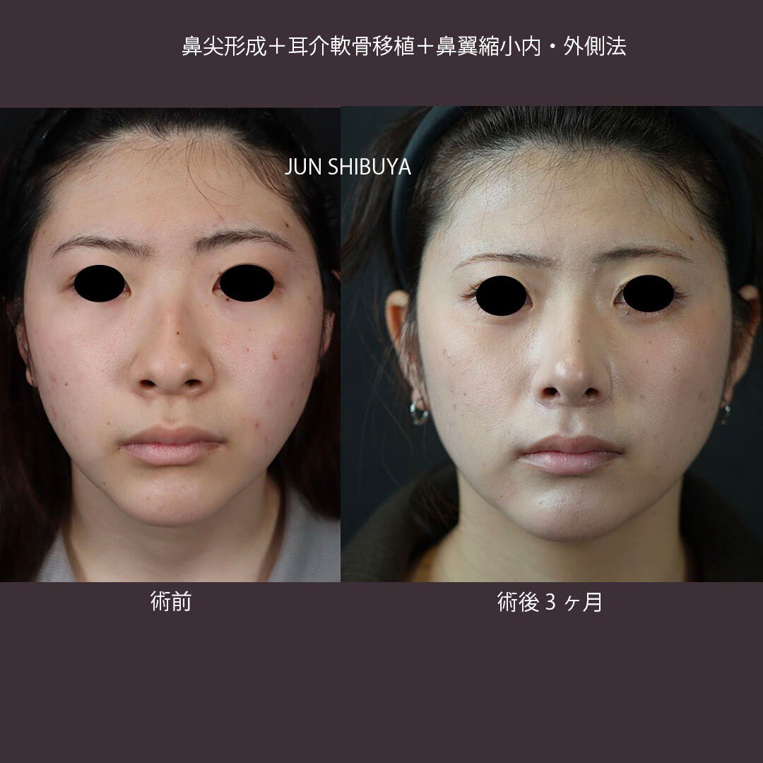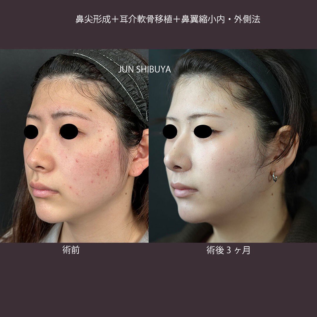 鼻オペです。鼻翼縮小だけだと鼻先の丸みが強調されそうだったので、鼻尖形成と耳介軟骨移植も併用し鼻先の形状のバランス調整行いました。 鼻翼縮小は内・外側法で行なっております。小鼻の傷跡の経過も分かるよう斜め・側面像も載せてますので参考にして下さい。 #鼻尖形成 #鼻翼縮小 pic.x.com/yTHnEUxJPC
