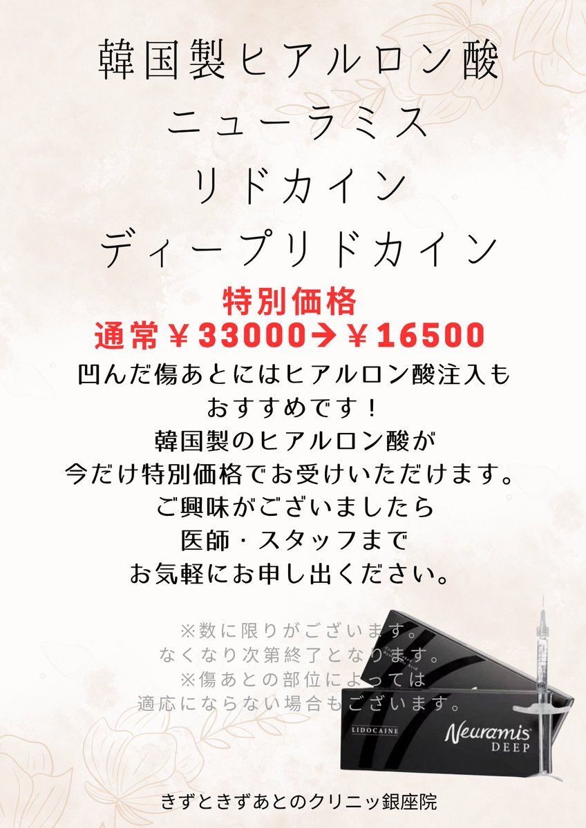 現在きずときずあとのクリニック銀座院ではヒアルロン酸注入のキャンペーンを行っております! 韓国製ヒアルロン酸ニューラミスが普段の半額でご購入いただけるキャンペーンです🙌 凹んだ傷跡が気になっている方はこの機会にぜひヒアルロン酸治療を行ってみませんか💓 #整形 #鼻翼縮小 #傷跡 pic.x.com/72wn5GmnVe