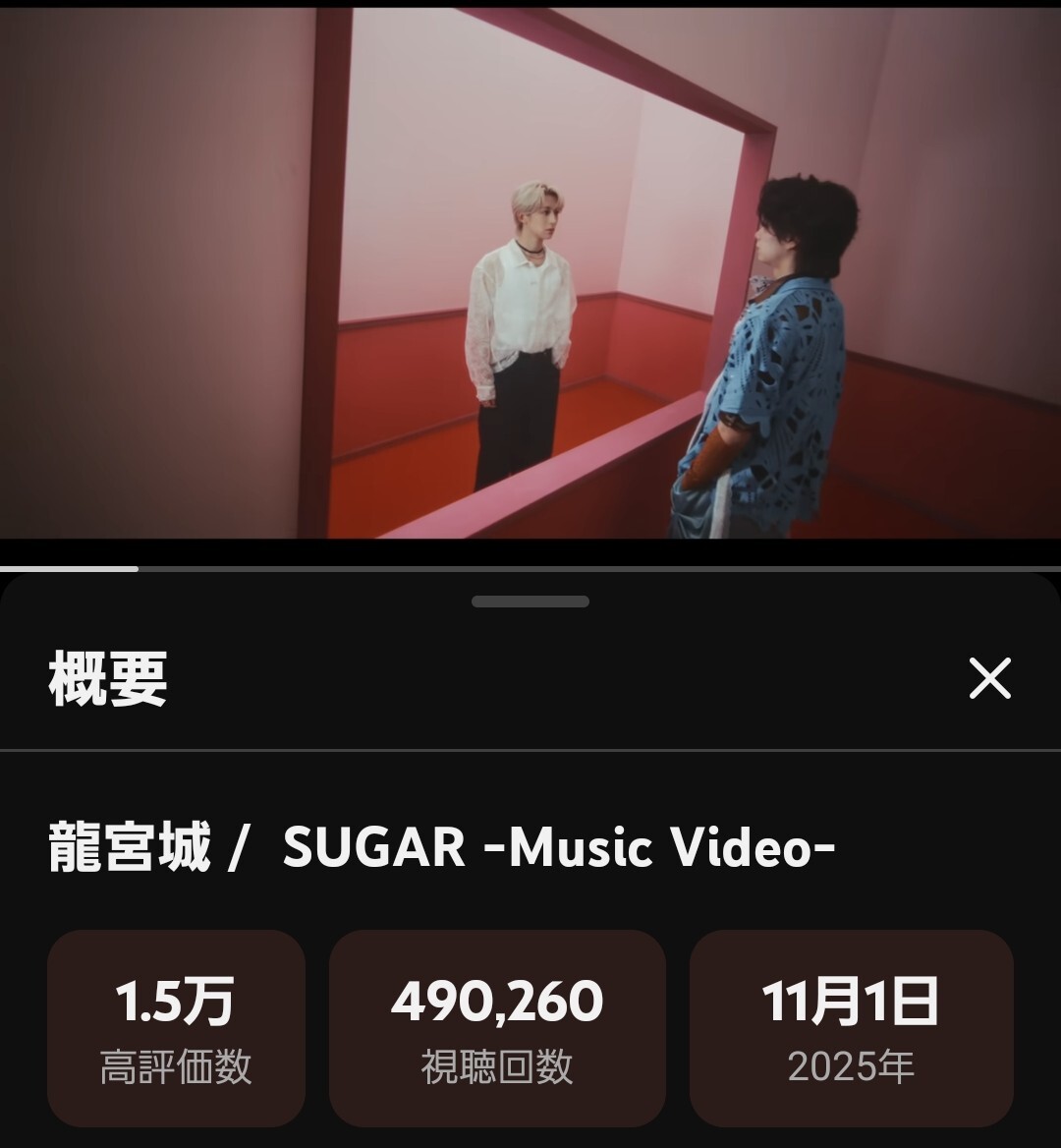 明日には50万回行くかなー?😆 この間人にオススメした時にやっぱ再生回数を基準で測られると実感して悔しかったので、どの曲も回しまくる‼️‼️ #龍宮城 #SUGAR youtu.be/0Xz_Ozh6BSk?si… pic.x.com/RDBUin8bQ2