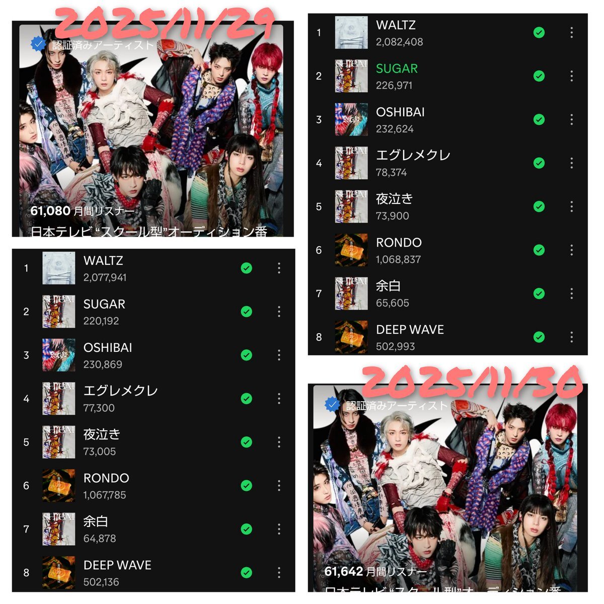 🟢spotify 月間リスナー 6.1万人 ⤴️⤴️ リリース週じゃないのにリスナー増えてるのすごいね。楽曲聴いてくかれる人が増えるの嬉しいね🐟️ #龍宮城 #SUGAR #WALTZ ↓🟢🐉公式の全曲プレイリスト↓ open.spotify.com/playlist/6bG2Z… pic.x.com/7nMR9cvwly