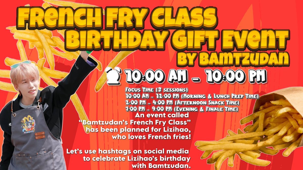 🍟French Fry Class Birthday Gift Event by Bamtzudan for Lizhao, who loves French fries🍟 ポテト好きなリズハオへ届けるフライドポテト教室! 📱SNS Support Challenge🍟 メインタグ #리즈하오_감튀하오_최애의최애 サブタグ #FriesWithLiZiHao #감튀사랑 #총공 #최애 #최애를구하라 pic.x.com/rmnx5fzJiq