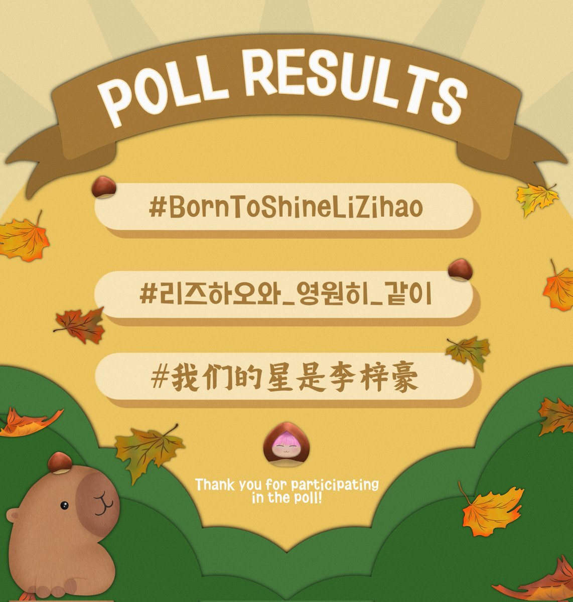 📣🌰 [POLL RESULTS] We want to thank everyone for participating in the polls! 🙌🏻 They've ended, and here are the results: #BornToShineLiZihao #리즈하오와_영원히_같이 #我们的星是李梓豪 Please stay tuned for our announcement about Zihao's birthday hashtag party coming later! x.com/LIZIHAOGLOBAL/…