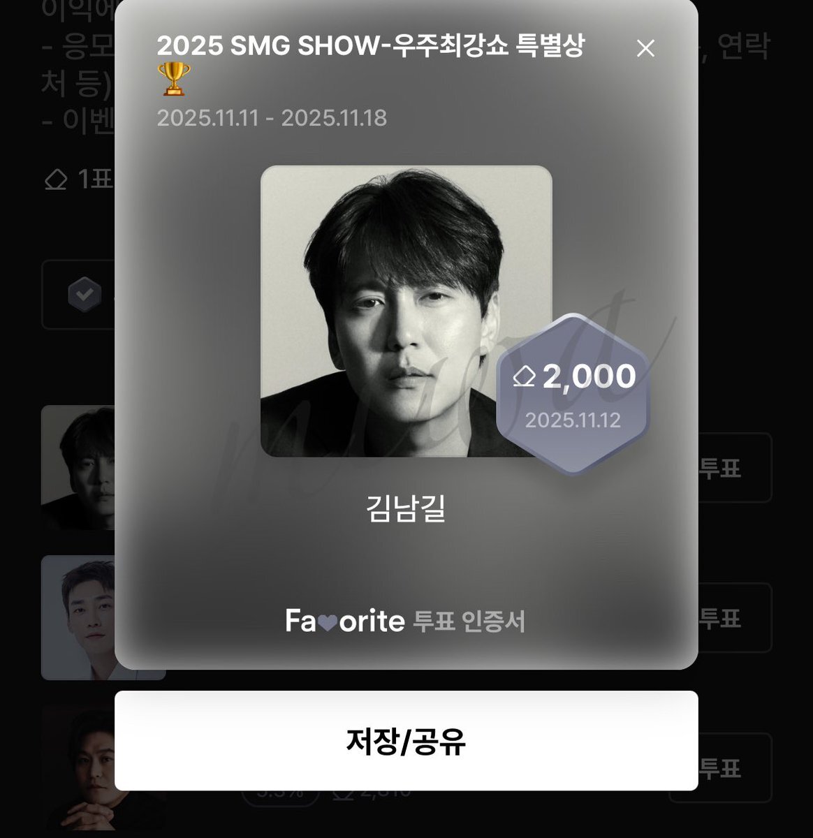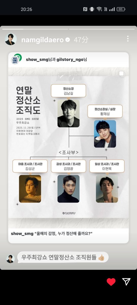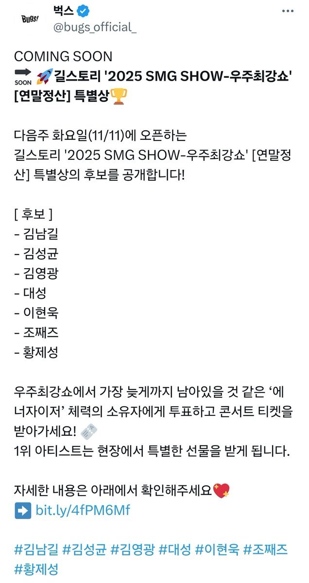 ‼️투표 오픈‼️ 🚀길스토리 '2025 SMG SHOW-우주최강쇼' [연말정산] 특별상🏆 우주최강쇼에서 가장 늦게까지 남아있을 것 같은 ‘에너자이저’ 체력의 소유자에게 투표하고 공연 티켓을 받아가세요! 🎫 1위 아티스트는 현장에서 특별한 선물을 받게 됩니다. [ 후보 ] - 김남길 - 김병철 - 김성균 -