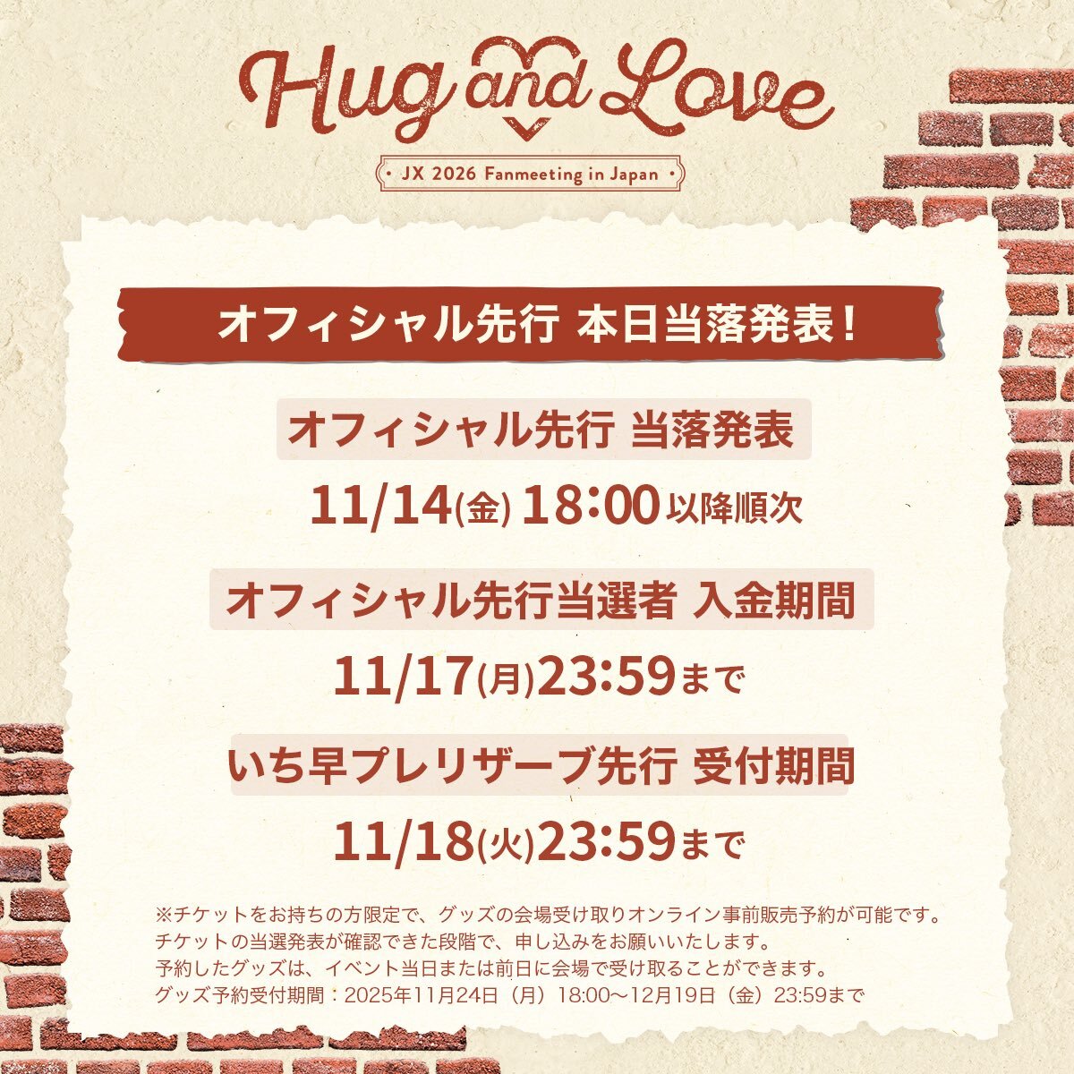 【JX 2026 JAPAN FANMEETING 'Hug & Love'】 オフィシャル先行の当落結果を 順次ご連絡しています✉️ 当選された方はご入金をお忘れなく✅ ⏰入金期間 11/14(金)18:00~11/17(月)23:59 #JX #JX_HugandLove #제이엑스 #김재중 #김준수 #JAEJOONG #XIA #Kimjaejoong #KimJunsu #ジェジュン #ジュンス pic.x.com/ou6MnxLL33