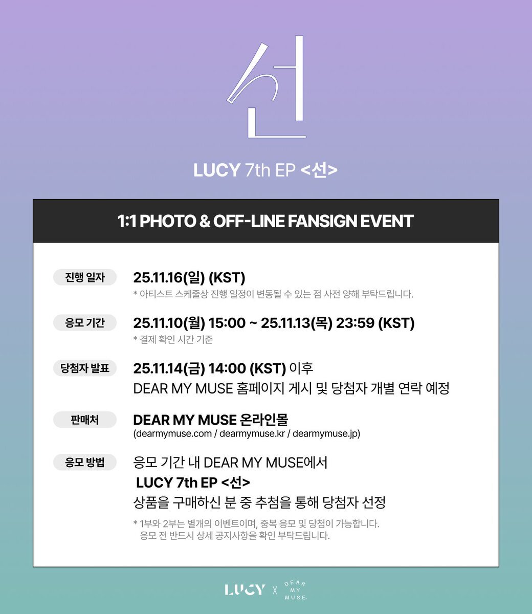 #LUCY #루시 7th EP <선> 1:1 PHOTO & OFF-LINE FANSIGN EVENT 🗓 응모: 11.10(월) 15:00 ~ 11.13(목) 23:59 (KST) 🗓 진행: 11.16(금) 13:00 / 15:00 (KST) 🔗 KR bit.ly/485OGeU 🔗 JP bit.ly/3Jus5zs 🔗 GLOBAL bit.ly/47JFlIj