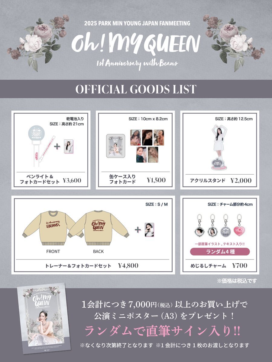 〖EVENT〗 👑2025 #PARKMINYOUNG JAPAN FANMEETING👑[Oh! MY QUEEN -1st Anniversary with Beans-]🫘✨ 📢グッズ販売のお知らせ ファンミーティング会場にてオフィシャルグッズの販売を行います🛒 #パク・ミニョン #パクミニョン #박민영 👇詳細はこちら👇 park-minyoung.jp/notice/4915 pic.x.com/72diuyl0hc