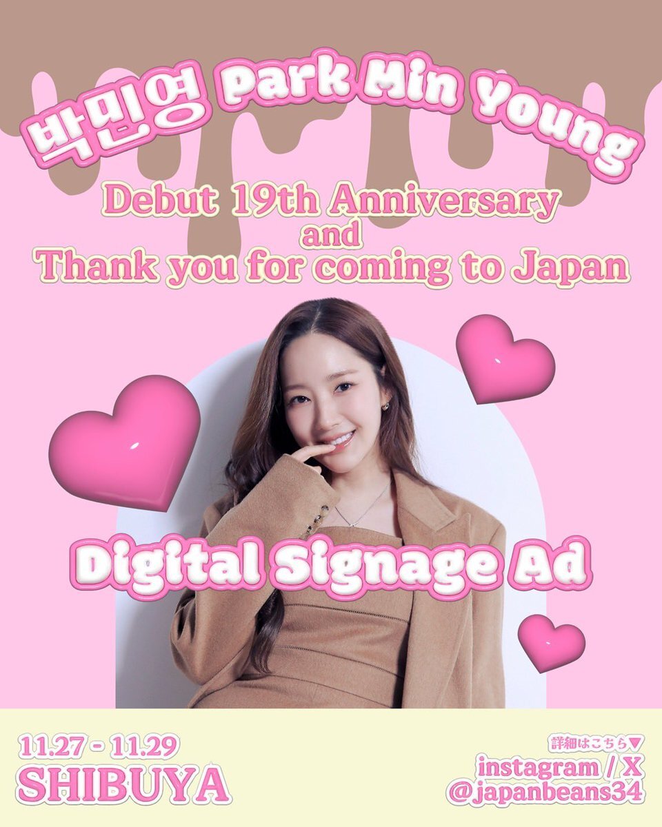 パクミニョンさんのデビュー19周年と日本ファンミーティング開催を記念して、応援広告を掲出します🫘 🗓️┊︎11/27(木)〜29(土) 🕘┊︎9:00〜24:00 🎬┊︎15秒×4回/毎時 📍┊︎渋谷(詳細は27日9時以降告知) 日本からミニョンさんにたくさんの愛を届けましょう🤍 #パクミニョン #parkminyoung #박민영 pic.x.com/HWcmtE7Y5V