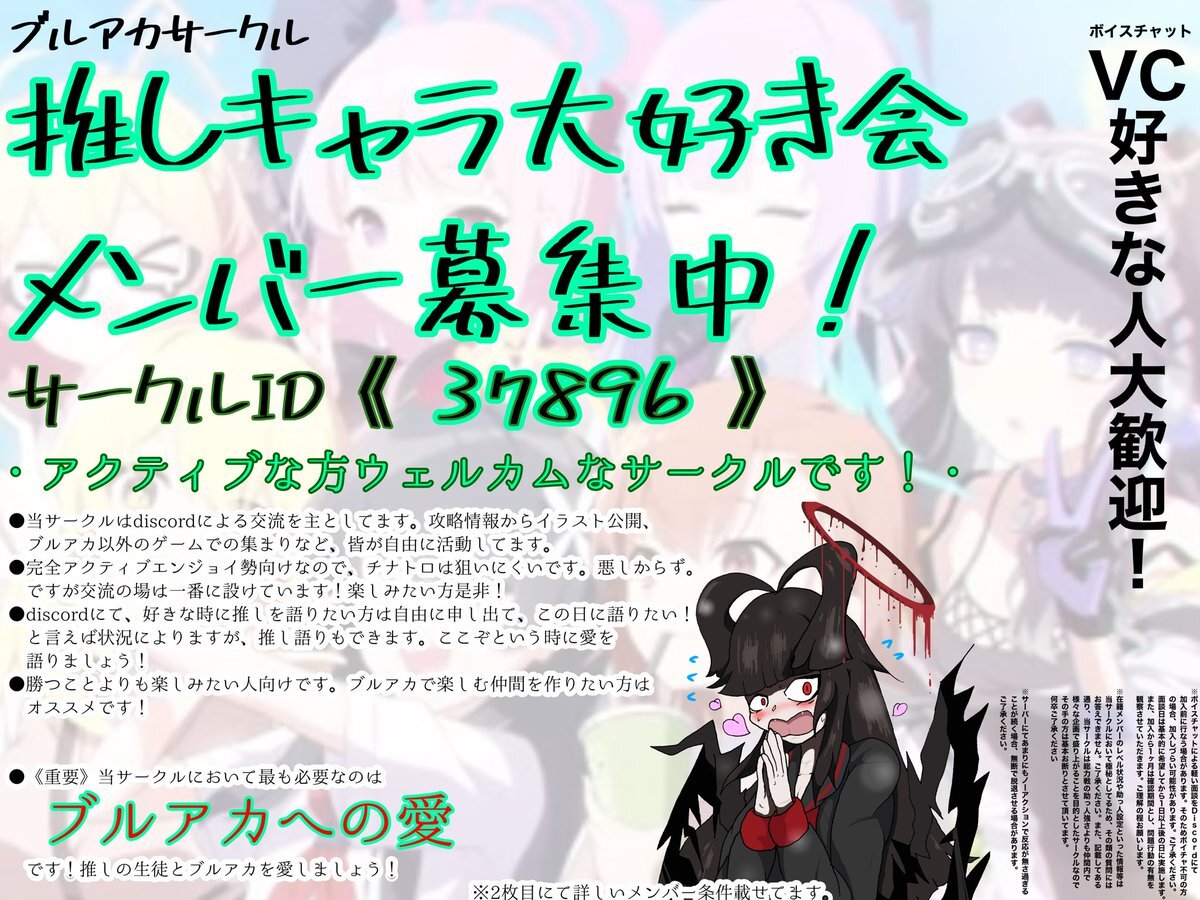 【 推しキャラ大好き会 】 ゲーム内サークル加入者募集中! ✨ID「 37896 」✨ ( VC交流したい方向け ) 𝕏でリプ反応見てからDMで スケ調整後にVC面談してるので 希望者は当ポストにリプを🙇♂️ ※仲間とのコミュツールは 主にDiscordを使用! #ブルアカサークル募集 #ブルアカサークルメンバー募集