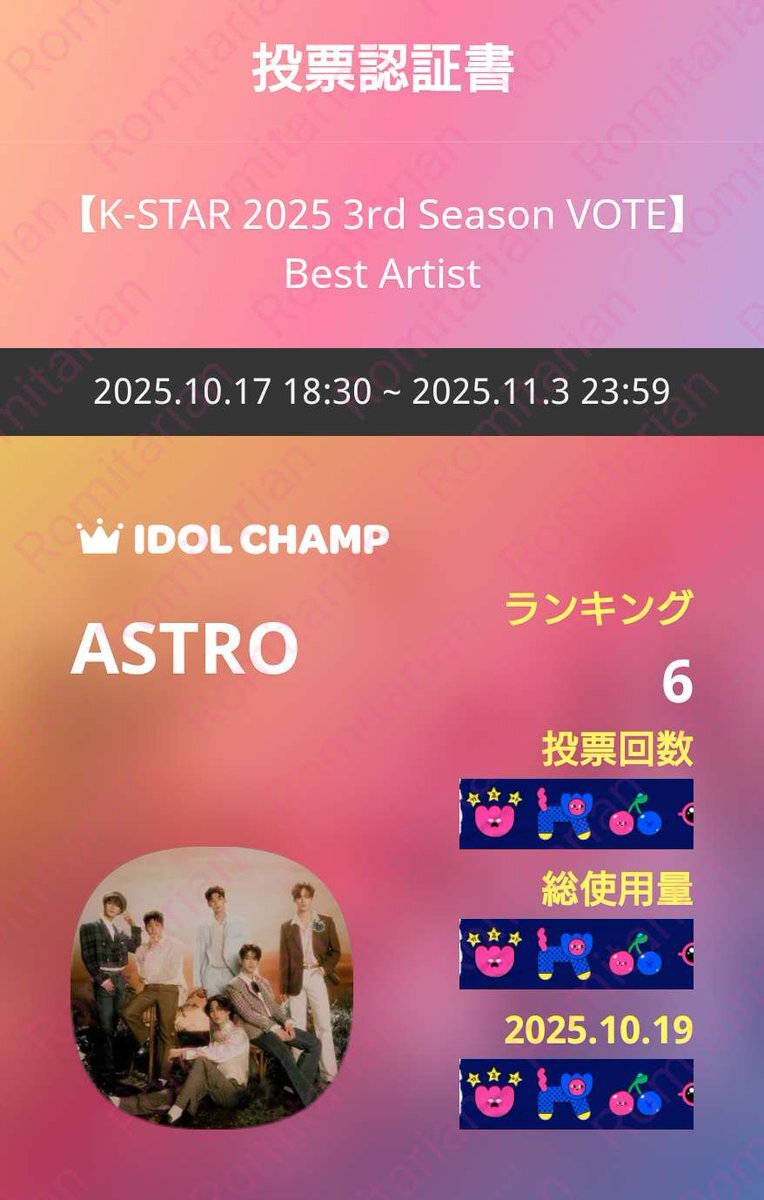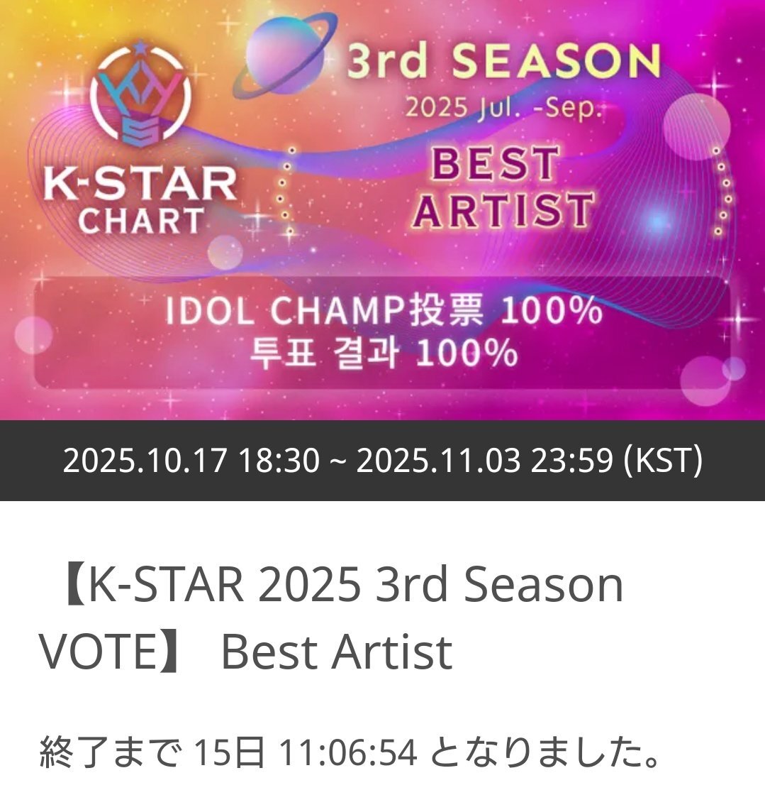 【K-STAR 2025 3rd Season VOTE】Best Artist 10/19㈰💜ASTRO💜に🗳 締切は11/3🈷23:59迄です IDOLCHAMP 아이돌챔프 "ASTRO" 투표 완료 promo-web.idolchamp.com/app_proxy.html… #아스트로 #ASTRO #아로하 #AROHA pic.x.com/SmBX1R9uVH