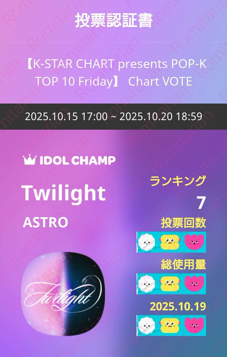 ASTRO💜AROHA お疲れ様です😊 【K-STAR CHART presents POP-K TOP 10 Friday】 Chart VOTE 10/19㈰💜ASTROに🗳 締切は明日10/20🈷18:59迄 IDOLCHAMP 아이돌챔프 "Twilight" 투표 완료 promo-web.idolchamp.com/app_proxy.html… #아스트로 #ASTRO #Twilight #아로하 #AROHA pic.x.com/uLbfZ7xVLO