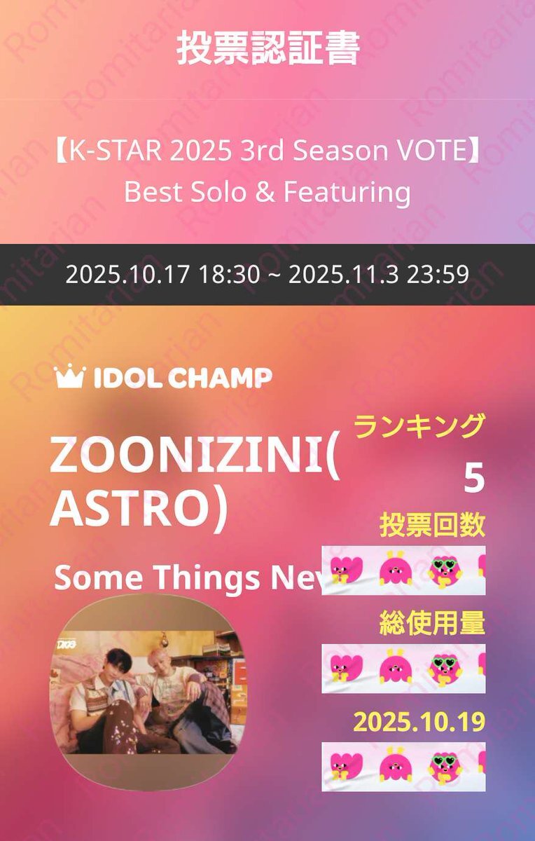 【K-STAR 2025 3rd Season VOTE】Best Soro & Featuring 10/19㈰🧡ZOONIZINI💚に🗳 締切は11/3🈷23:59迄 IDOLCHAMP 아이돌챔프 "ZOONIZINI(ASTRO)" 투표 완료 promo-web.idolchamp.com/app_proxy.html… #주니지니 #ZOONIZINI #아스트로 #ASTRO #아로하 #AROHA #DICE #Some_Things_Never_Change pic.x.com/Jo2HyxaH4d