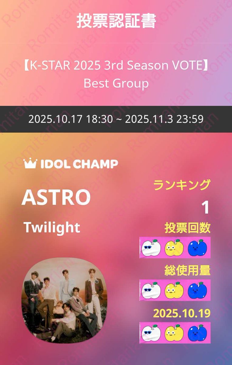 【K-STAR 2025 3 rd Season VOTE】Best Grup 10/19㈰💜ASTRO💜に🗳 締切は11/3🈷23:59迄 IDOLCHAMP 아이돌챔프 "ASTRO" 투표 완료 promo-web.idolchamp.com/app_proxy.html… #아스트로 #ASTRO #Twilight #아로하 #AROHA pic.x.com/KPtGo0p5lY