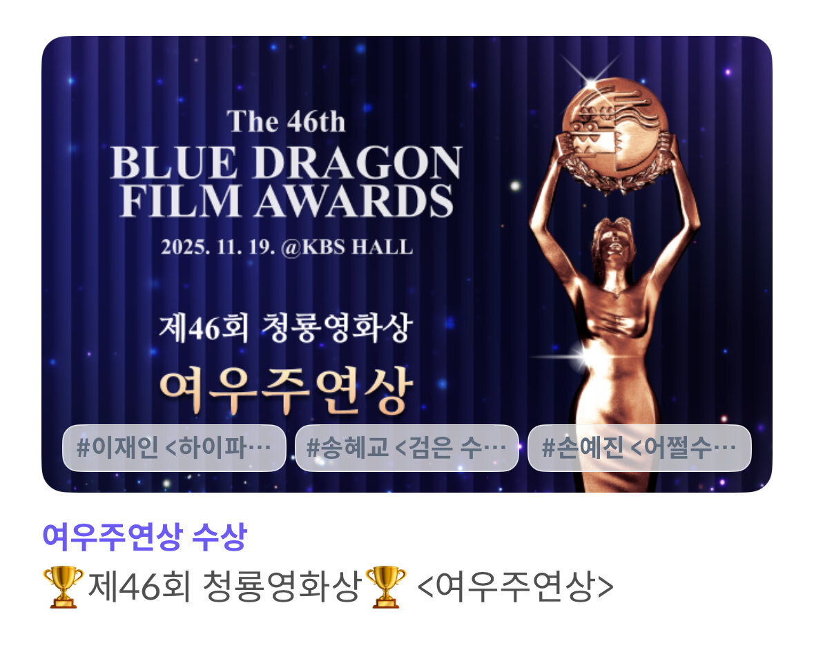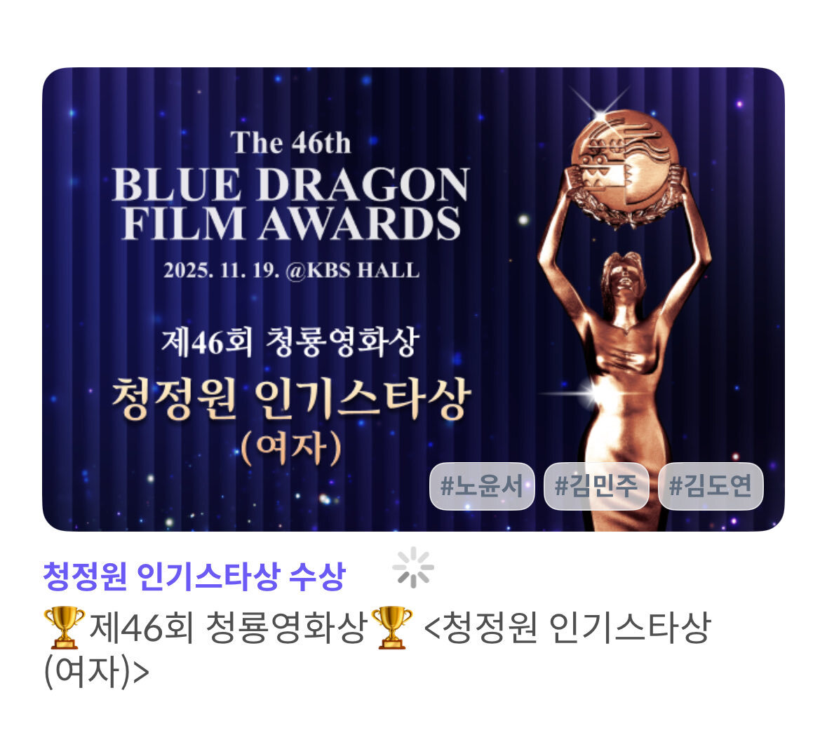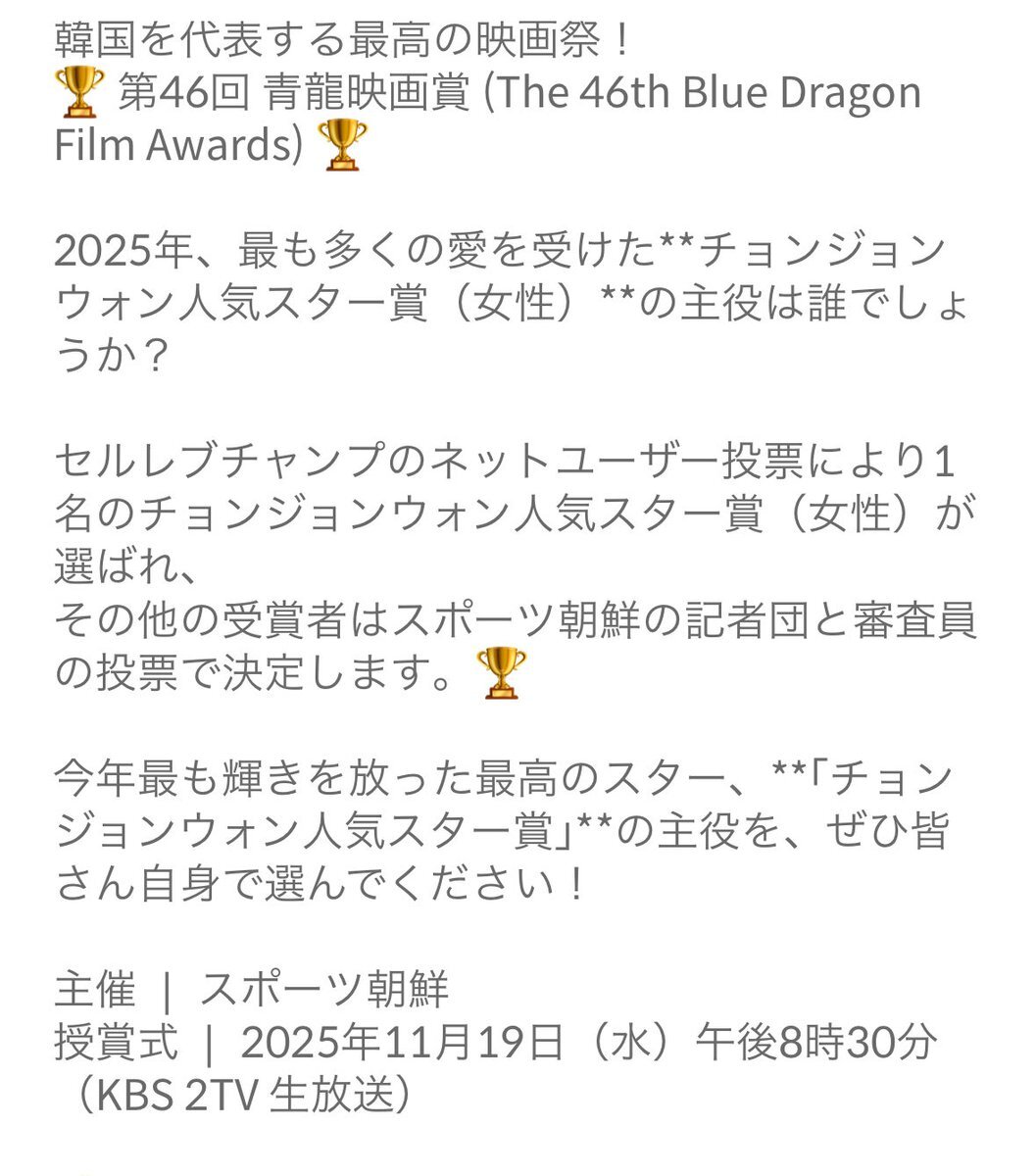 [The 46th #BlueDragonFilmAwards] 🎬대한민국 최고의 영화 축제🎬 🏆제 46회 청룡영화상🏆 ❤️ 투표 𝐎/𝐏/𝐄/𝐍❤️ 올해를 빛낸 ✨수상작(자)✨를 선정해주세요! • • • 🏆배우/감독 부문 🏆인기상 (남/여) 📆10.21~ 11.18 ----- 🏆제작/스탭 부문 📆10.21~ 11.9 🔗links.celebchamp.com/soKC