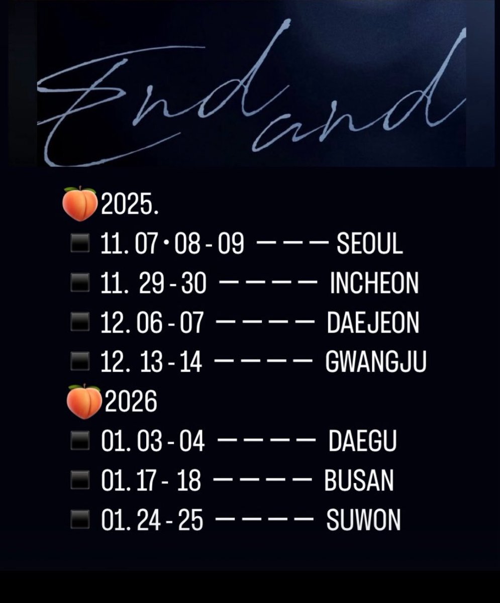 ❤️【 インターパーク 】 2025. ▪️11. 07・08 - 09 ーーSEOUL 🧡【 Yes24 】 2025 ▪️11. 29 - 30 ーーINCHEON ▪️12. 06 - 07 ーーDAEJEON ▪️12. 13 - 14 ーーGWANGJU 2026 ▪️01. 03 - 04 ーーDAEGU ▪️01. 17 - 18 ーー BUSAN ▪️01. 24 - 25 ーー SUWON #이창섭 #엔드앤드 pic.x.com/ejhCuTOP54