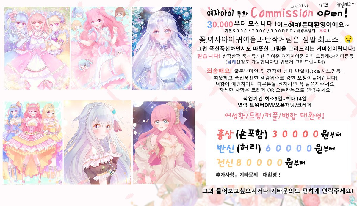 #RT #커미션 #커미션_홍보 #커미션_RT #커미션_재오픈 #그림_커미션 오랜만에 커미션 모집올려봐요!!!🥰🥰🥰 목표 금액 달성 시 RT 추첨 한분께 무료 커미션그림을 그려 드립니다🩷🩷🩷 자캐 드림 장르 모두 귀여운 미소녀들은 전부 환영하는 커미션이에요~ 그외 문의도 전부 받고있으니 편하게