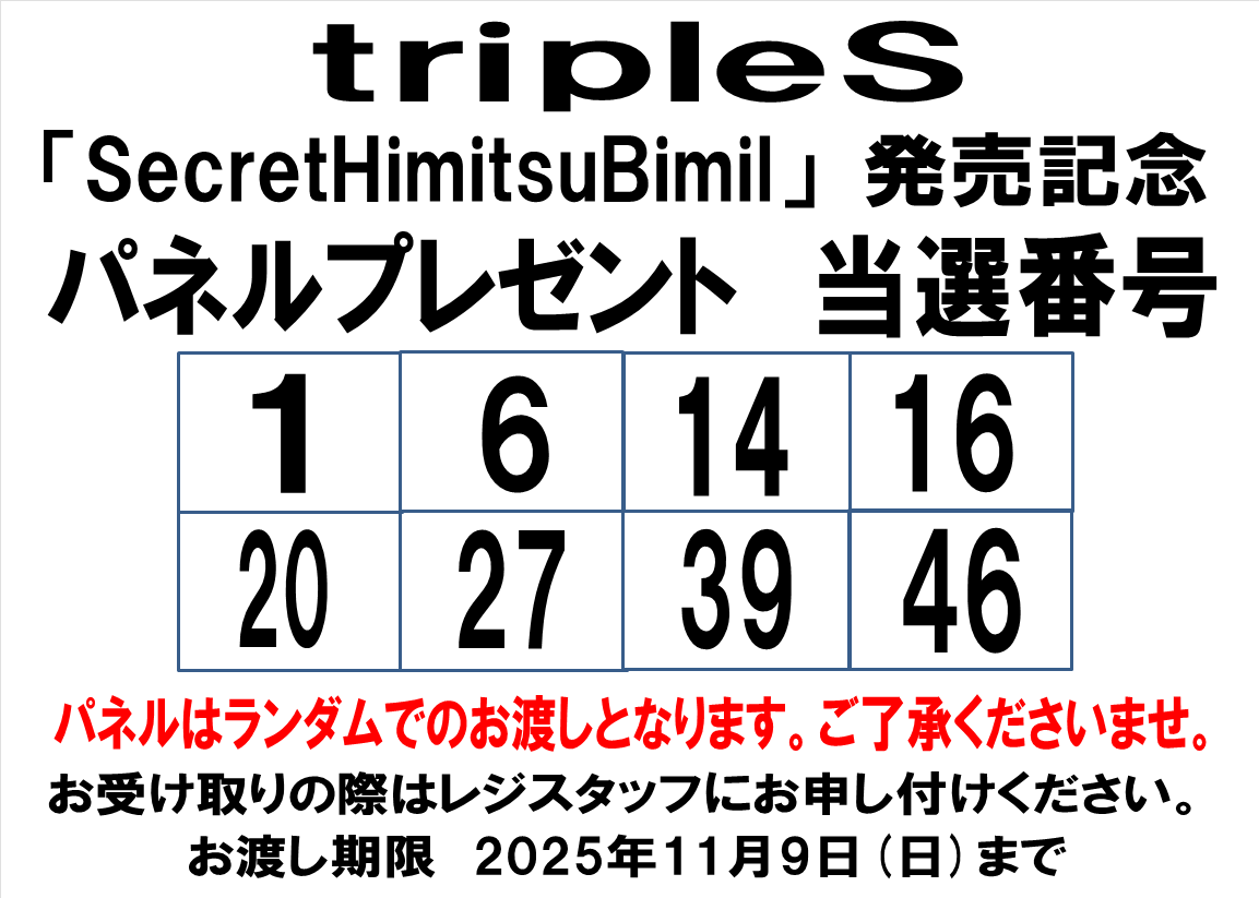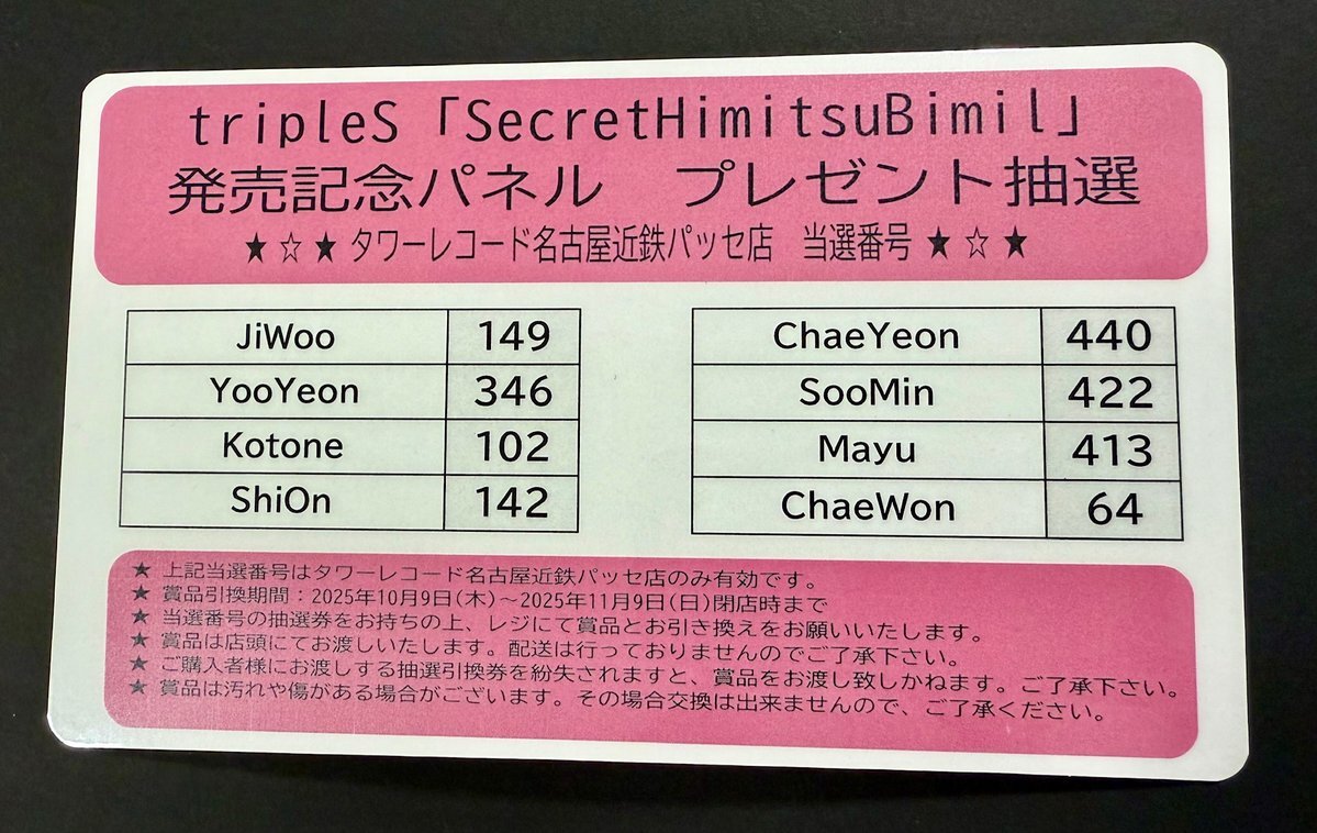 【当選発表🎊】 tripleS「SecretHimitsuBimil」発売記念パネルプレゼント 当選番号の発表です🎉 当選されたみなさま、おめでとうございます🎊 【当選パネルお渡し期間】 2025年10月9日(木)~2025年11月9日(日)閉店まで #tripleS #트리플에스 #トリプルS #トリプルエス #トエス pic.x.com/lcXoffncRs