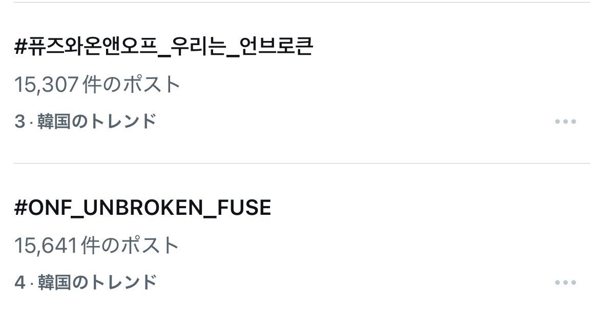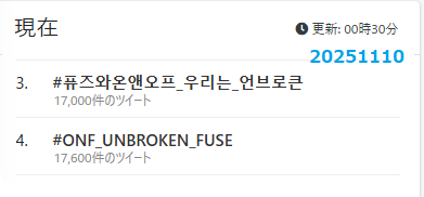 251110のオネノプちゃん、11/10(月)18時に9thミニアルバムのリリースを記念して、ハッシタグイベントで韓国Twitterのトレンドで3位と4位にランクイン💡 #ONF_UNBROKEN_FUSE #퓨즈와온앤오프_우리는_언브로큰 pic.x.com/f6HUX2w1m6