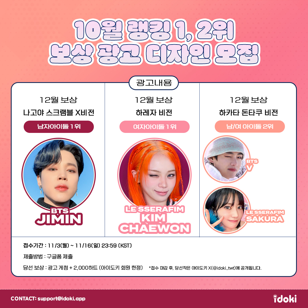 ❣️ 𝗶𝗱𝗼𝗸𝗶 𝗡𝗘𝗪𝗦 10월 메인랭킹🏆 🥇 BTS 지민, LE SSERAFIM 김채원 🥈 BTS 뷔, LE SSERAFIM 사쿠라 10월 메인랭킹 광고 영상 시안 모집 중! 💌 forms.gle/U6nMVBgmkkHPMA… 자세한 내용은 아이도키 ‘소식’ 탭에서 확인해 주세요! 👉idoki.chottu.link/vhasNe #idoki #아이도키 #アイドキ