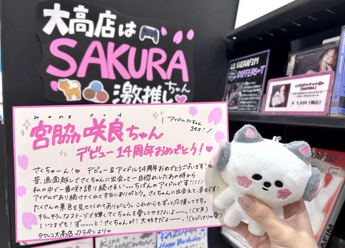 #LE_SSERAFIM】 本日10/23は,LE SSERAFIMの #SAKURA ちゃんこと #宮脇咲良 ちゃんアイドルデビュー14周年!🎊 おめでとうございます!🫶🌸 これからも良いことがたくさん咲きますように...!🌸 タワレコ大高はSAKURAちゃん激推し!💖 #사쿠라 #꾸라 #르세라핌 #피어나 #sakumail #LESSERAFIM pic.x.com/eDTlOM92E4