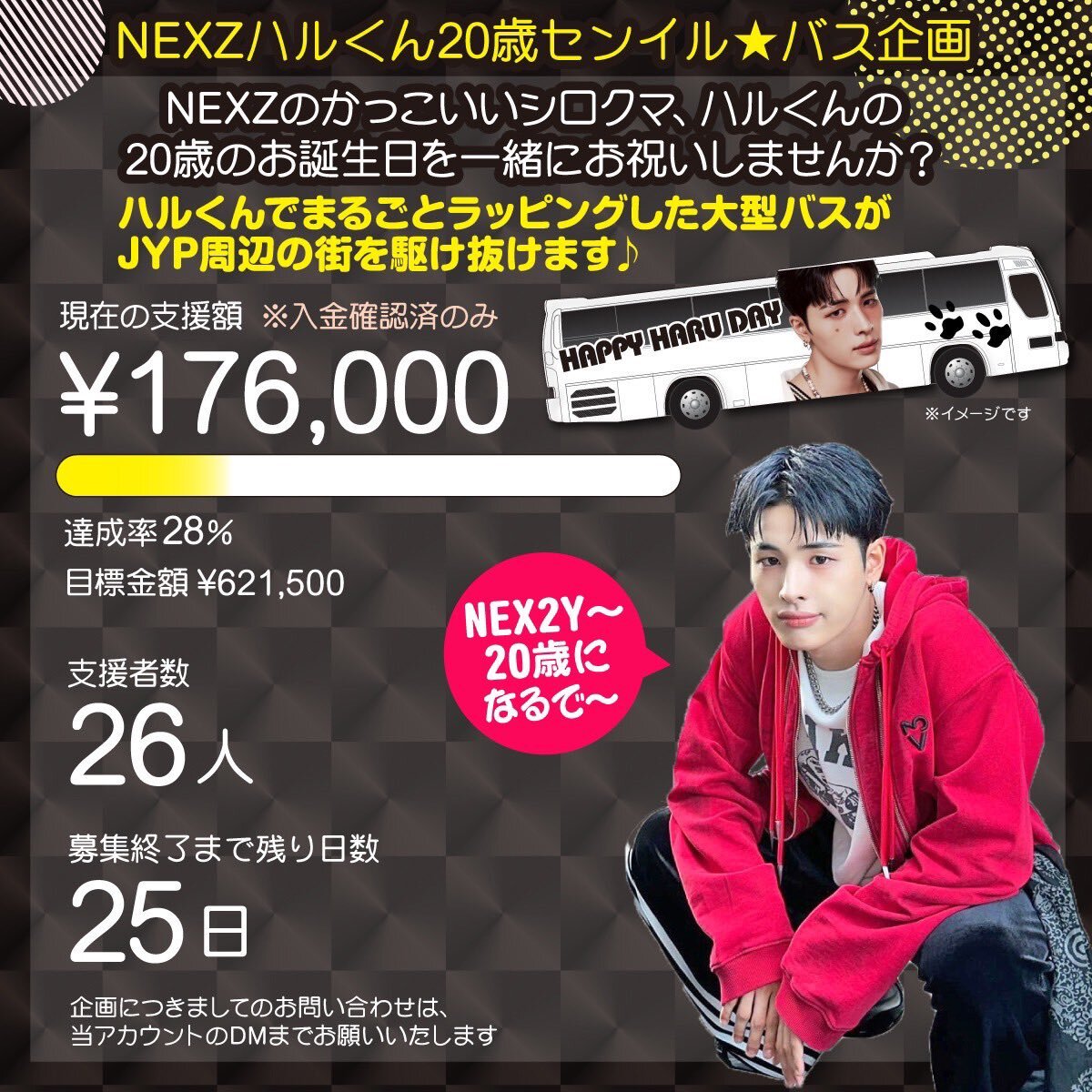🐻❄️💫ハルセンイル ラッピングバス🚌🎶 たくさんのご支援本当にありがとうございます🙇♀️🖤 目標達成率は現在【28%】❤️🔥 📣締切日:11/10(月)※目標達成次第終了 素敵なバスでハルくんの20歳のお誕生日をお祝いしませんか🥰🥂 お申込みは⬇️のリンクからお願いします✨ #NEXZ #HARU #하루 pic.x.com/UTAi58ATY1