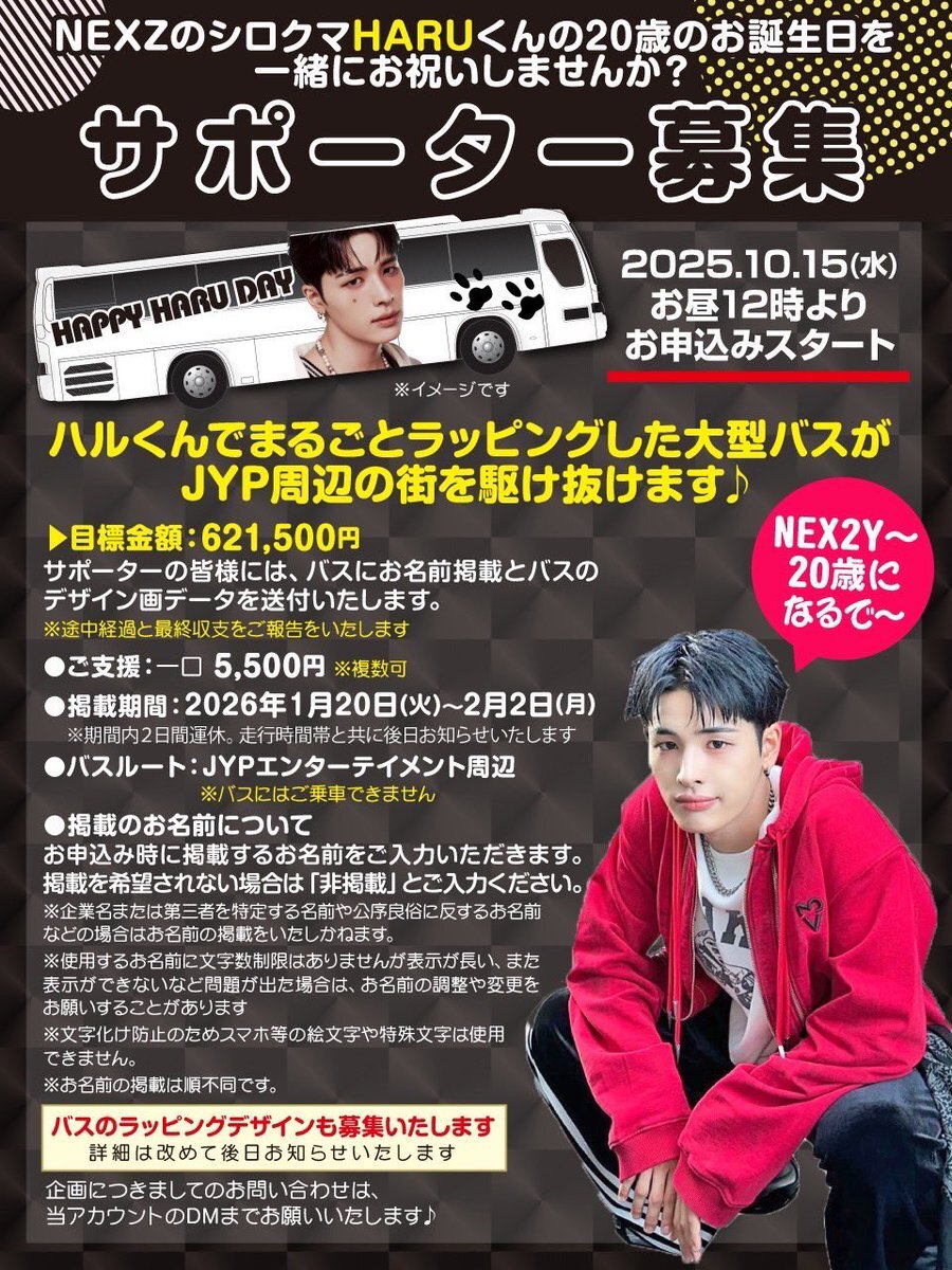 🐻❄️💫ハルラッピングバス企画🚌 支援者さん募集中❤️🔥 👉️締切日: 11月10日(月) 📣目標達成次第終了 📣未達の場合、施行いたしません 早速、多くのご支援を頂いております✨ みんなでお祝いしましょう🎂🖤 ・ご支援者様のお名前をバス側面に掲載✍️ ・ポストの拡散お願いします🙇🏻♀️ #NEXZ #HARU #하루 x.com/tomoya2006119/…