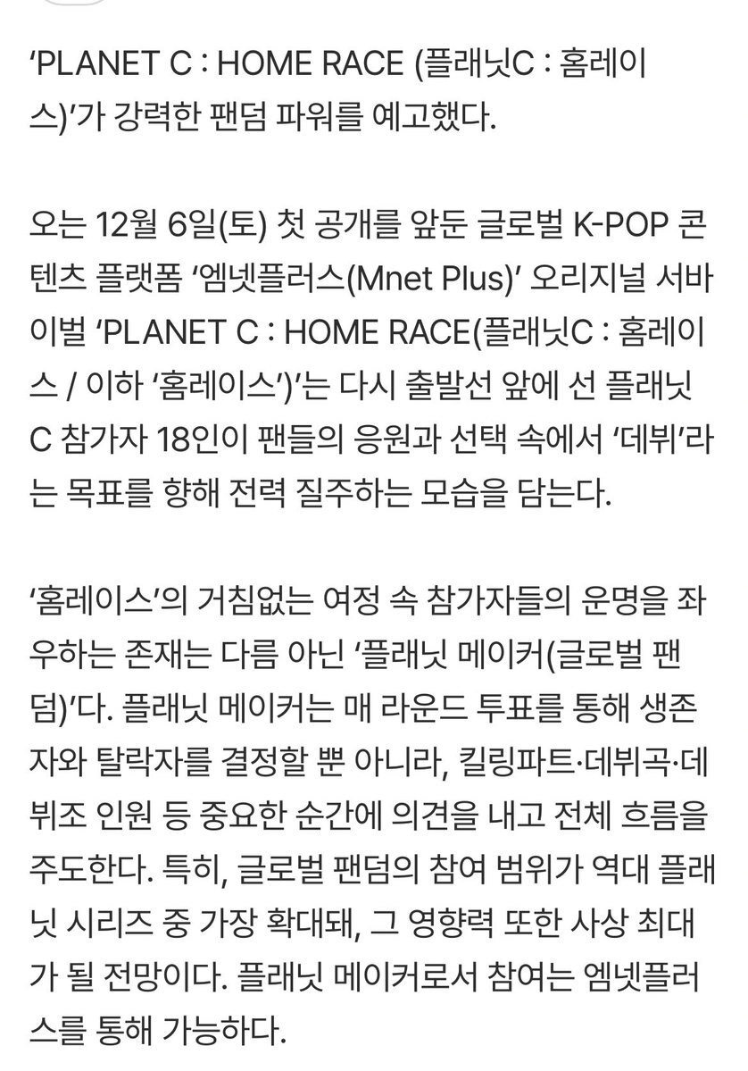 📑|#PLANETC #HOMERACE #플래닛C #홈레이스 製作陣は“2回の生存”からデビューを決定 プラネットメーカーは投票を通じて生存者と脱落者を決めるだけでなく、キリングパート・デビュ一曲・デビュー人数など重要な瞬間に意見を出して全体の流れを主導 ?????? 🔗 m.entertain.naver.com/home/article/4… pic.x.com/6KJIkeRI9a