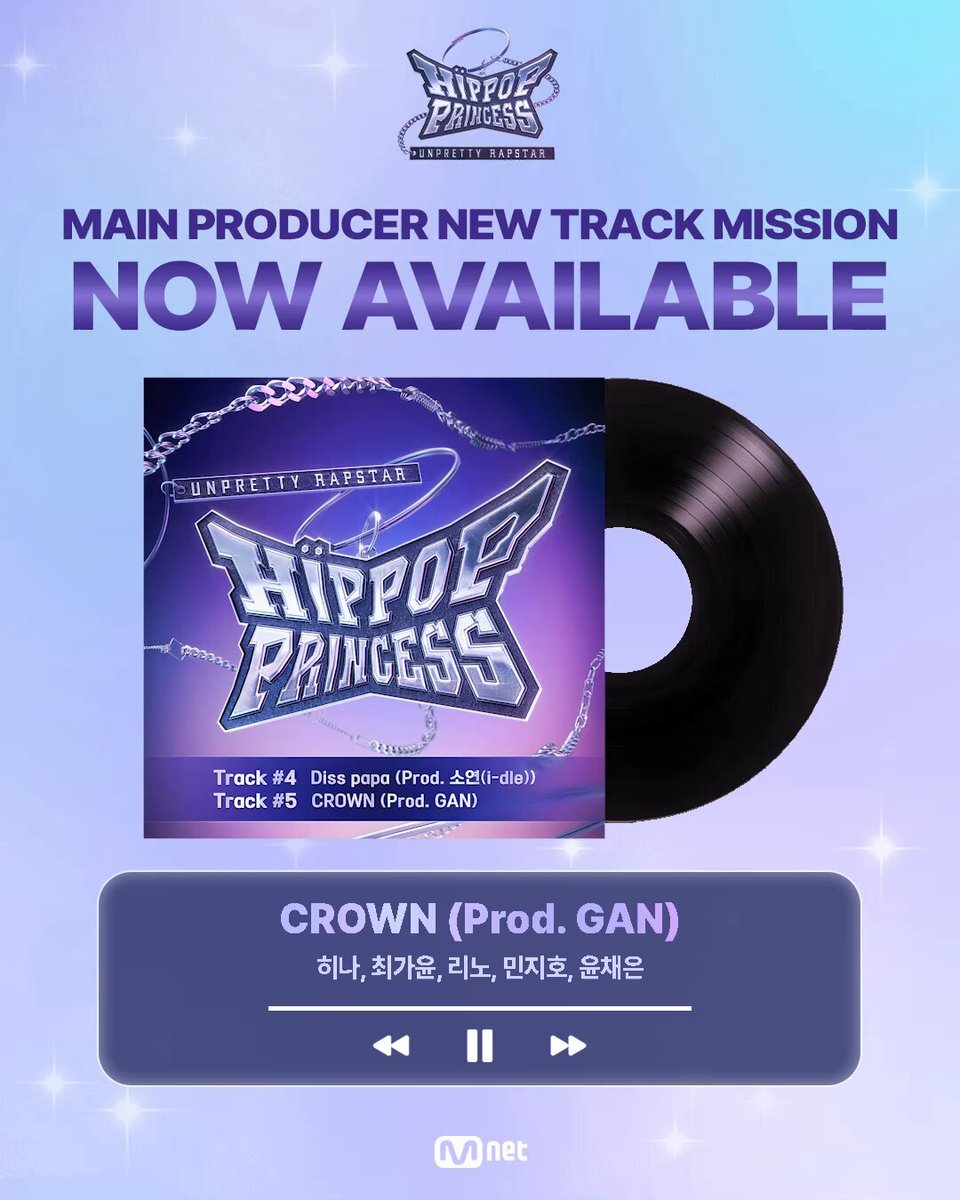 [#HIPPOPPrincess] Track #4, #5 メインプロデューサー新曲ミッション🎵 HIPの頂点、メインプロデューサー新曲ミッションの音源が公開! 今すぐ全音源サイトでチェックしてください🎧 💿TRACK LIST💿 01 Diss papa (Prod. SOYEON (i-dle)) 02 CROWN (Prod. GAN) 𝙈𝙖𝙠𝙚 𝙮𝙤𝙪𝙧𝙨𝙚𝙡𝙛.